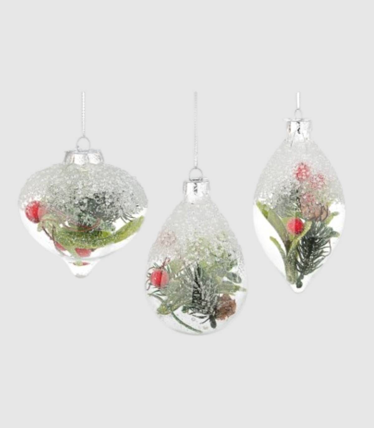 Pack de seis colgantes transparentes con hojas verdes en su interior, dos de cada forma, con tres formas diferentes, para colgar en el árbol de navidad.