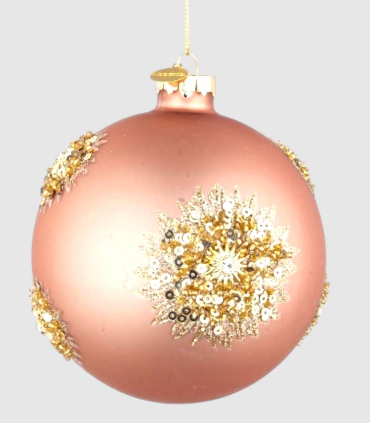 Pack de cuatro bolas de navidad de color rosa con detalles dorados, para colgar en el árbol de navidad.