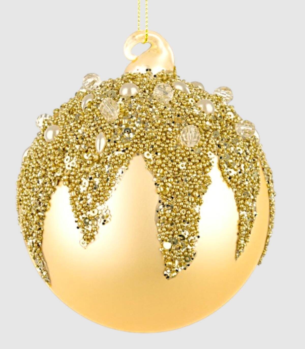 Pack de cuatro bolas de navidad de color champagne con detalles dorados, para colgar en el árbol de navidad.