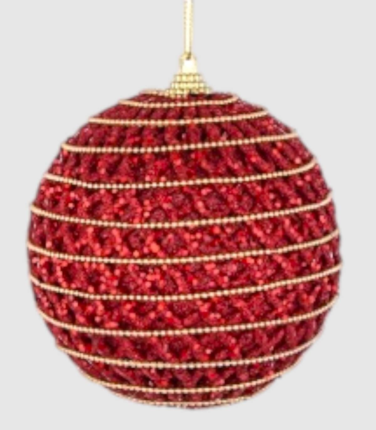 Pack de cuatro bolas de navidad de color rojo con detalles dorados, para colgar en el árbol de navidad.