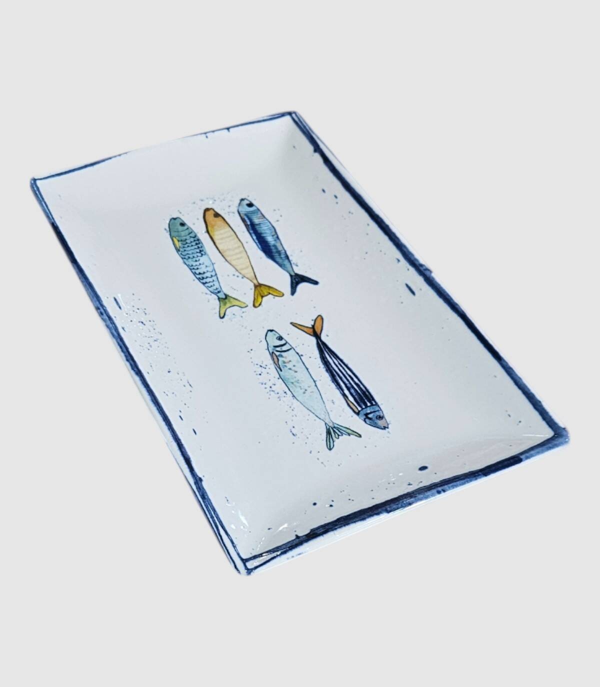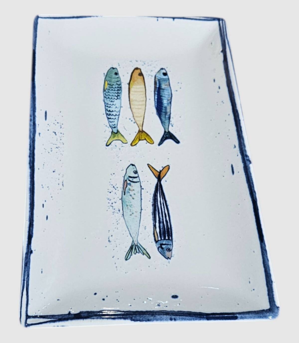 Fuente rectangular pequeña, descubre la elegancia marina con este plato rectangular de porcelana, una pieza decorativa que añade un toque artístico a tu mesa. El diseño presenta una delicada ilustración de cinco peces en tonos azules, turquesas y dorados, dispuestos artísticamente sobre un fondo blanco inmaculado. El borde azul marino enmarca perfectamente la composición, añadiendo un elemento de distinción. Este plato versátil es ideal para servir aperitivos, sushi, pescados o simplemente como elemento decorativo en tu mesa o aparador. La porcelana de alta calidad garantiza durabilidad y resistencia para el uso diario. El diseño artesanal de los peces, con sus escamas detalladas y salpicaduras de color, crea una sensación de movimiento y frescura. Las dimensiones rectangulares del plato lo hacen perfecto para presentaciones creativas de alimentos o como centro de mesa. Un complemento perfecto para mesas con estilo mediterráneo o costero.