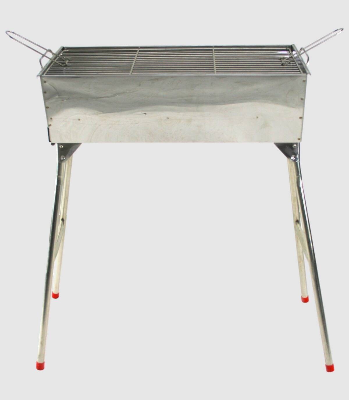 Esta barbacoa hecha en aluminio se compone de caja rectangular con asas, parrilla con asas y patas con tapones antideslizantes. Tiene una tapa lateral que permite limpiar la parte inferior de la parrilla. Las patas son plegables para un transporte mas comodo.