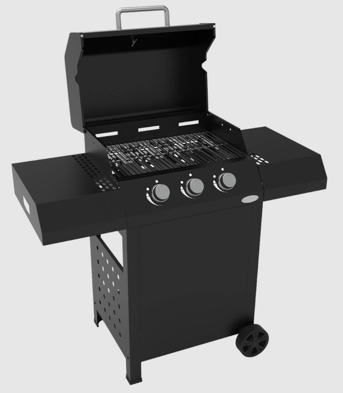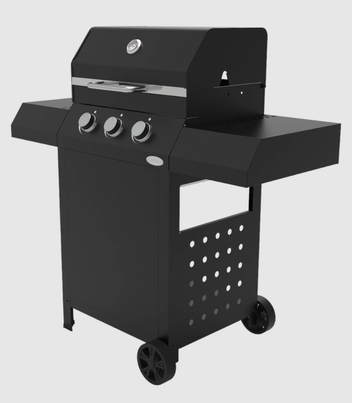 La barbacoa de gas butano y propano Cazorla se compone de dos parrillas extraibles de acero inoxidable, tres quemadores de acero inoxidable con potencia de 8,5 kw de encendido piezo-eléctrico, tapa con función horno con termómetro si esta cerrada o elevada para ahumar, dos bandejas laterales, dos ruedas y dos patas.