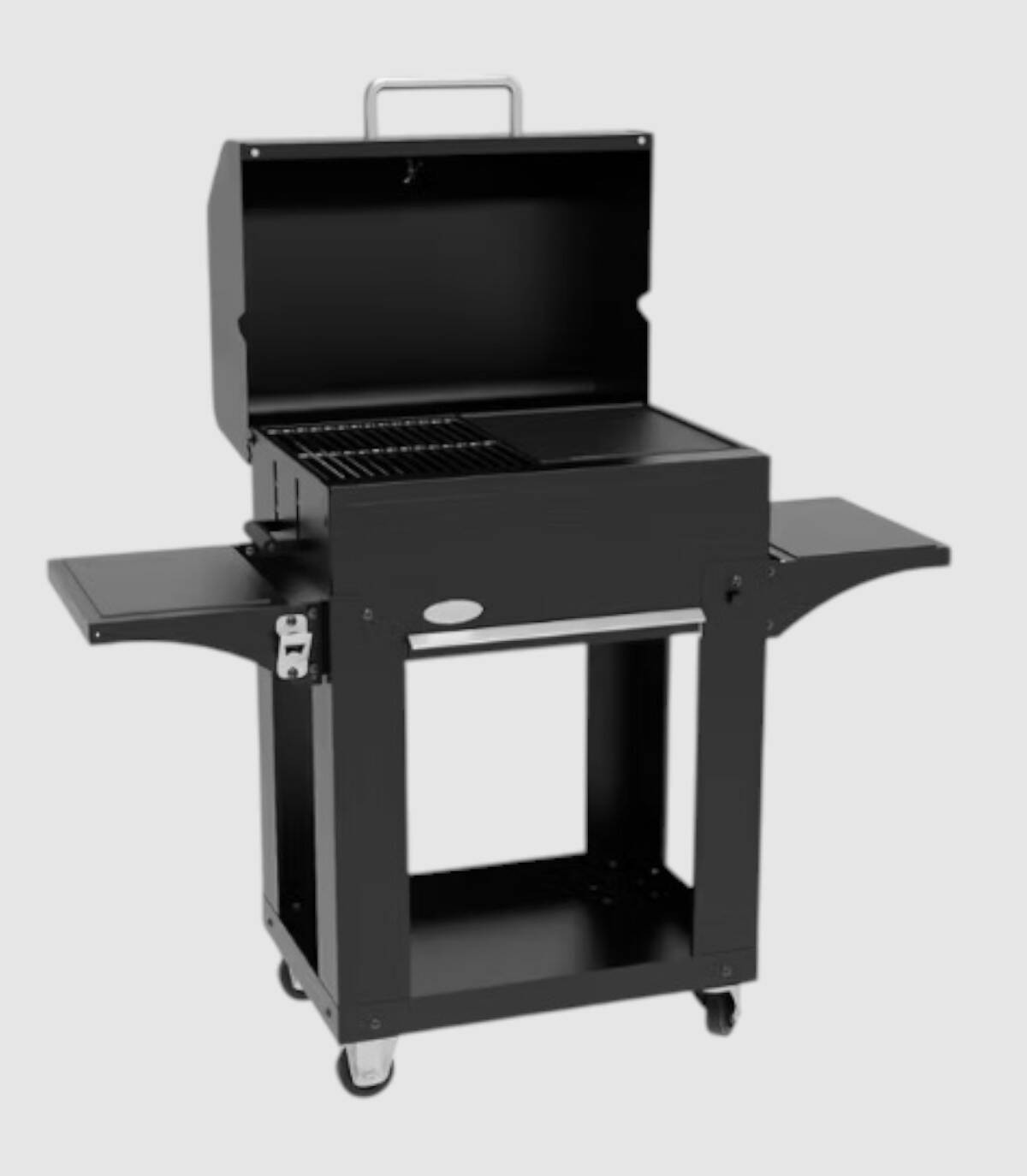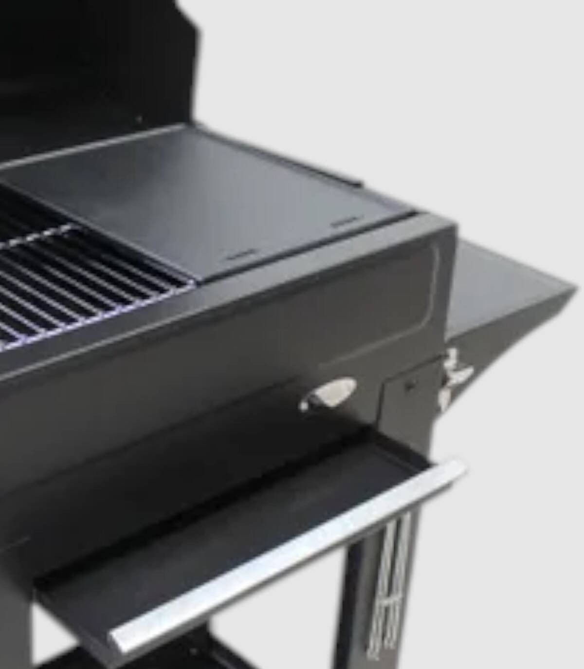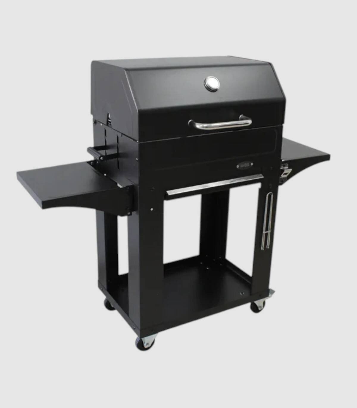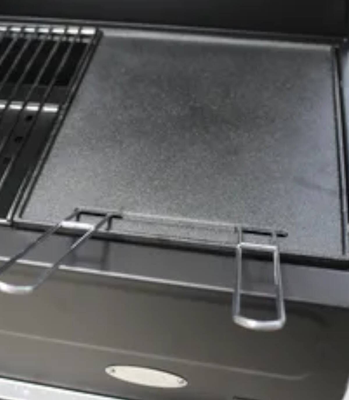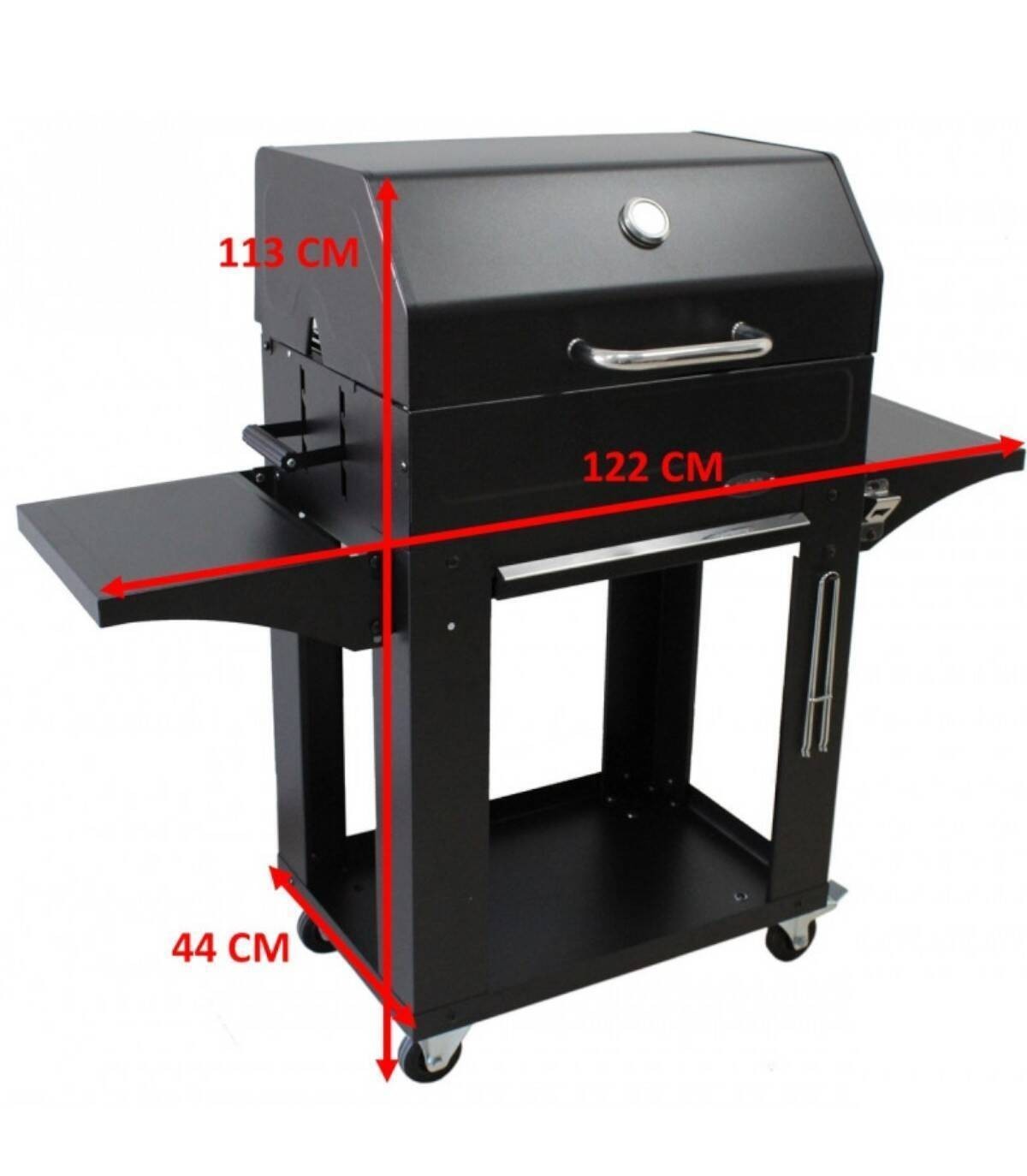 La barbacoa Miconos se compone de dos parrillas extraibles de acero inoxidable, tres quemadores de acero inoxidable con potencia de 8,5 kw de encendido piezo-eléctrico, tapa con función horno con termómetro si esta cerrada o elevada para ahumar, dos bandejas laterales, dos ruedas y dos patas.