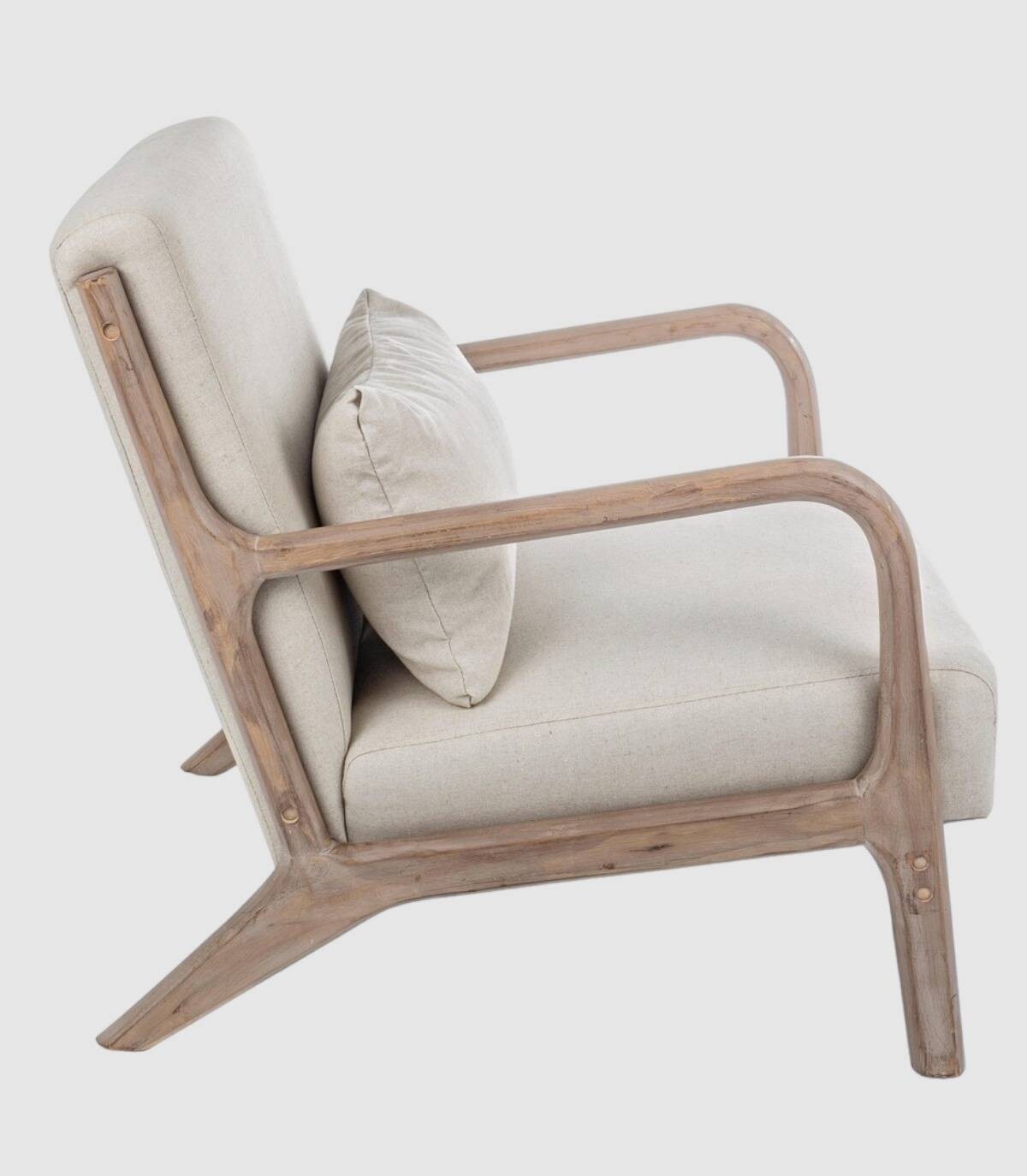 La butaca Ancilla tiene estructura de madera de caucho, asiento con funda no extraible de tejido (40% algodón, 30% de poliéster y 30% de lino).