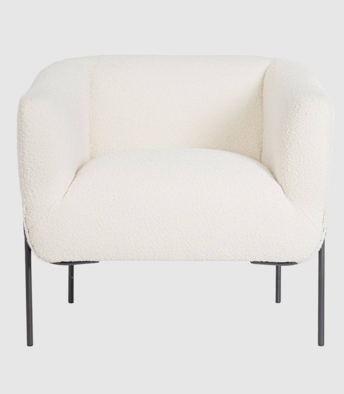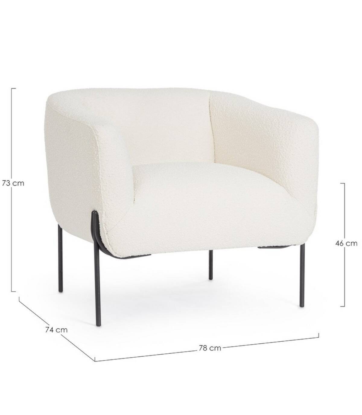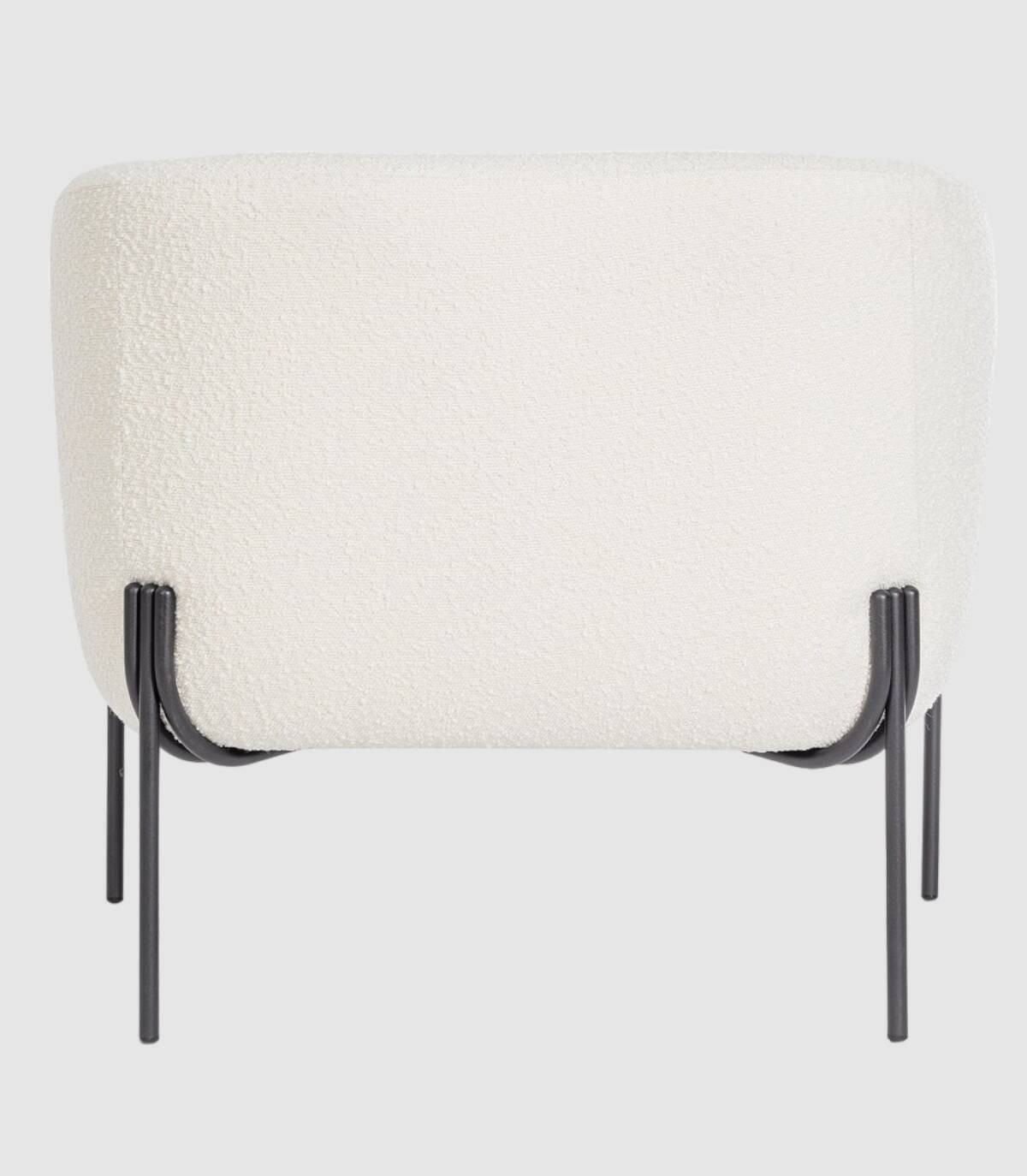 La butaca blanca Claudine tiene estructura de contrachapado, patas (requieren montaje) de acero barnizado a polvo epoxi, revestimiento de poliéster efecto bucle. Densidad del relleno: asiento 28kg/m3, respaldo 20kg/m3. No desenfundable.