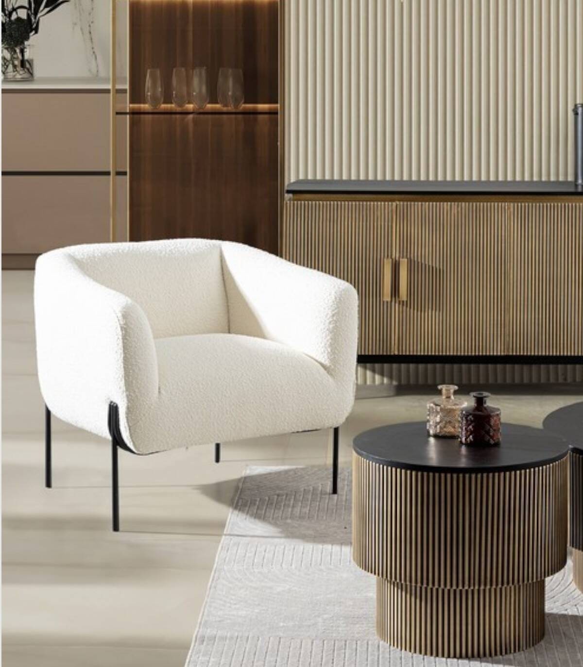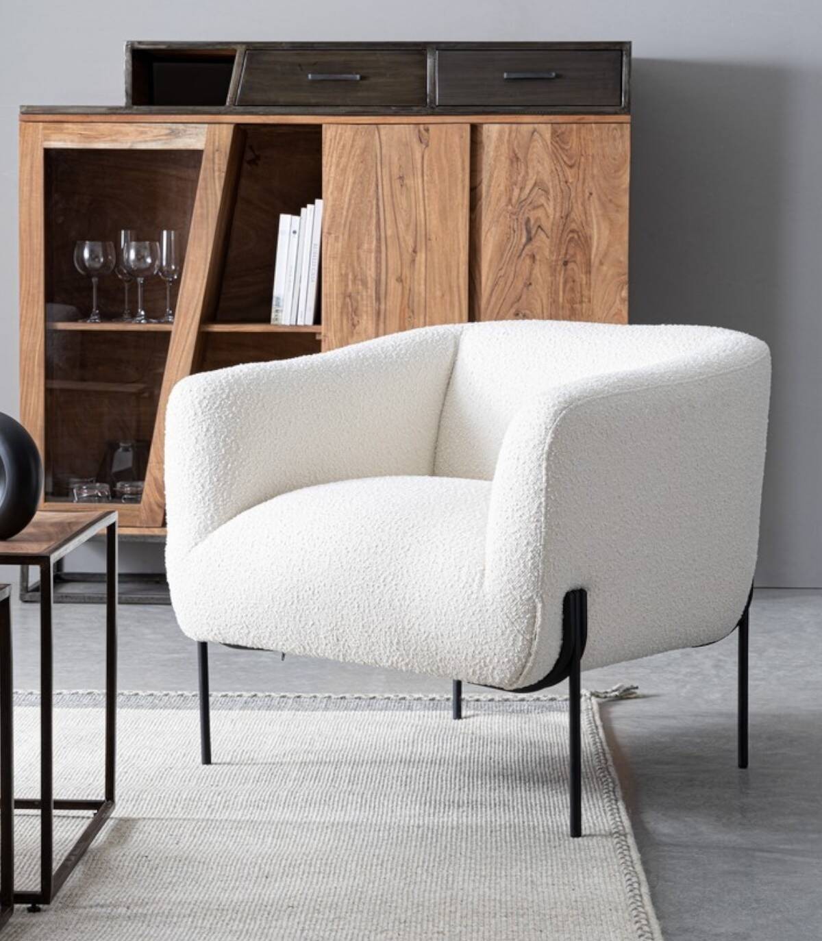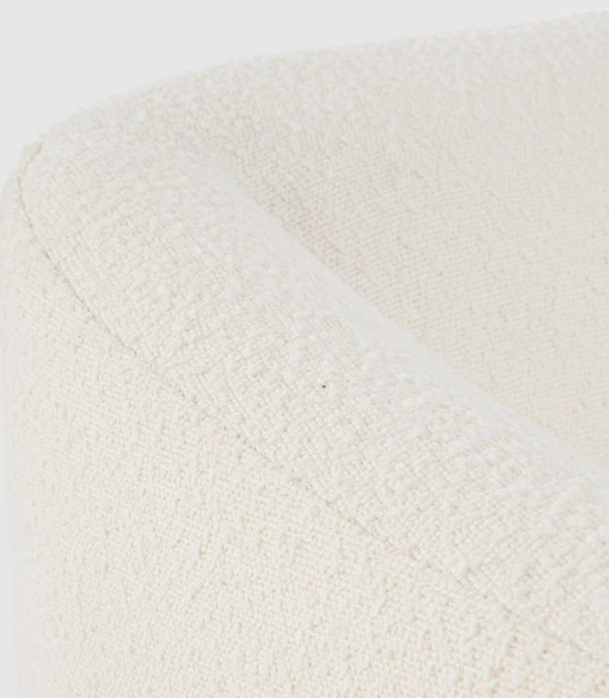 La butaca blanca Claudine tiene estructura de contrachapado, patas (requieren montaje) de acero barnizado a polvo epoxi, revestimiento de poliéster efecto bucle. Densidad del relleno: asiento 28kg/m3, respaldo 20kg/m3. No desenfundable.