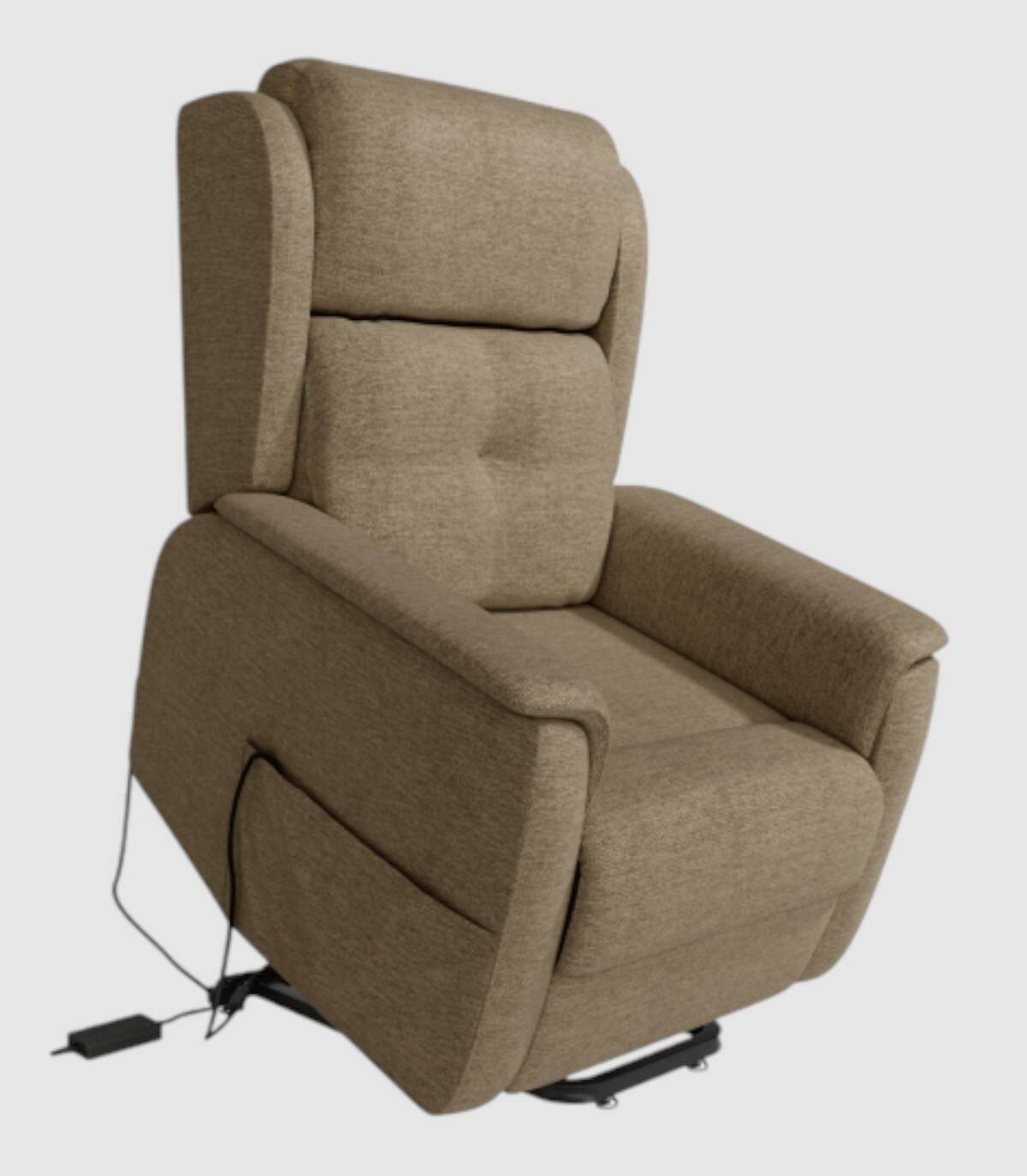La butaca Cloe eléctrico con mando de dos acciones tiene estructura de hierro pintado color negro, tablero contrachapado y base con entrelazado de muelles metálicos de 1 mm en zigzag con cincha de alta resistencia.