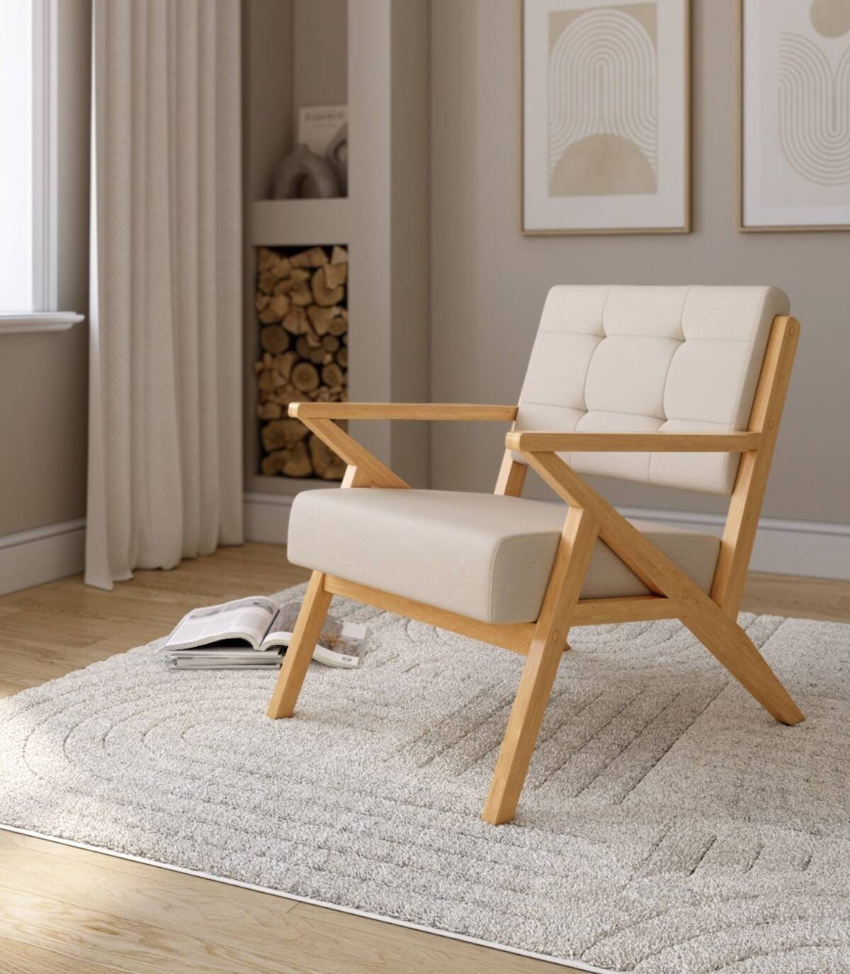 La butaca Sakura se compone de estructura, patas, reposabrazos de madera color light y asiento, respaldo tapizado en color arena.