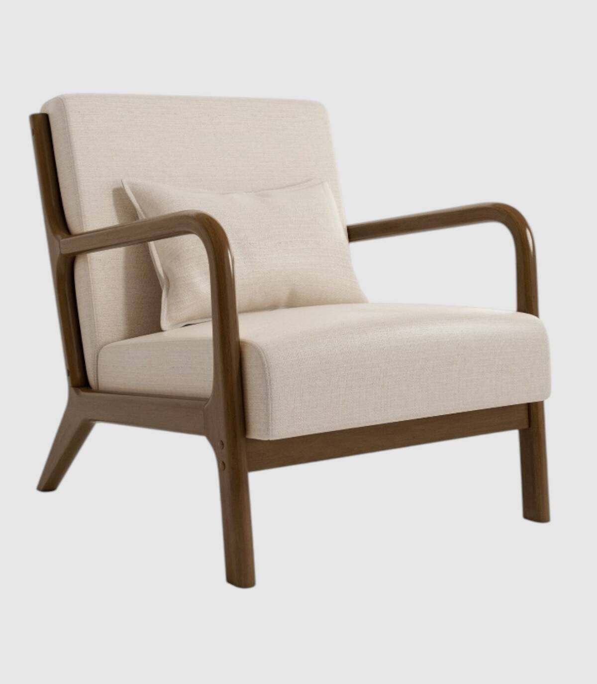 La butaca Ume se compone de estructura, patas, reposabrazos de madera color dark y asiento, respaldo tapizado en color nacar.