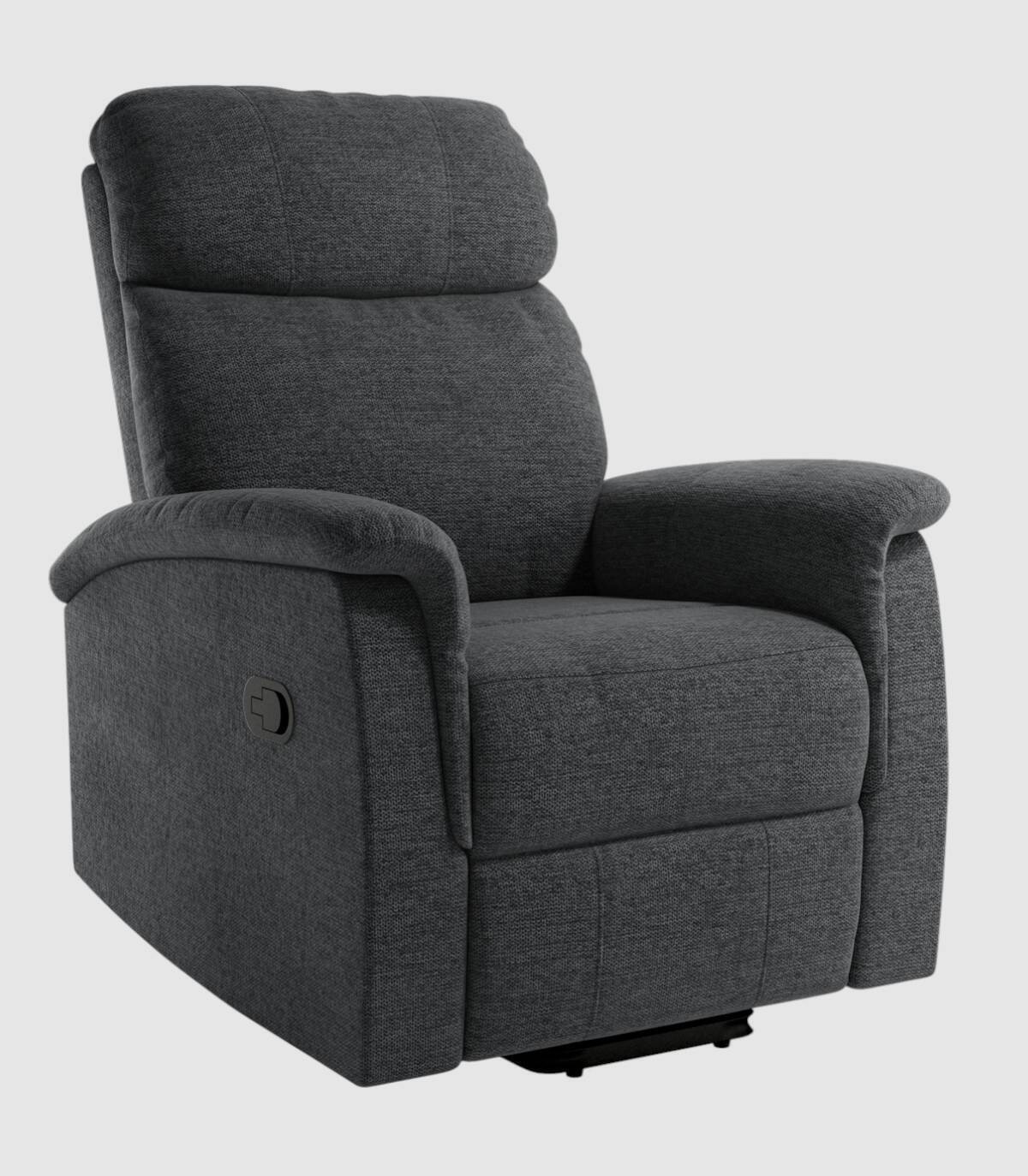 La butaca Mia relax reclinable con palanca manual se compone de estructura de metal y asiento, respaldo, reposabrazos tapizado en color pizarra.