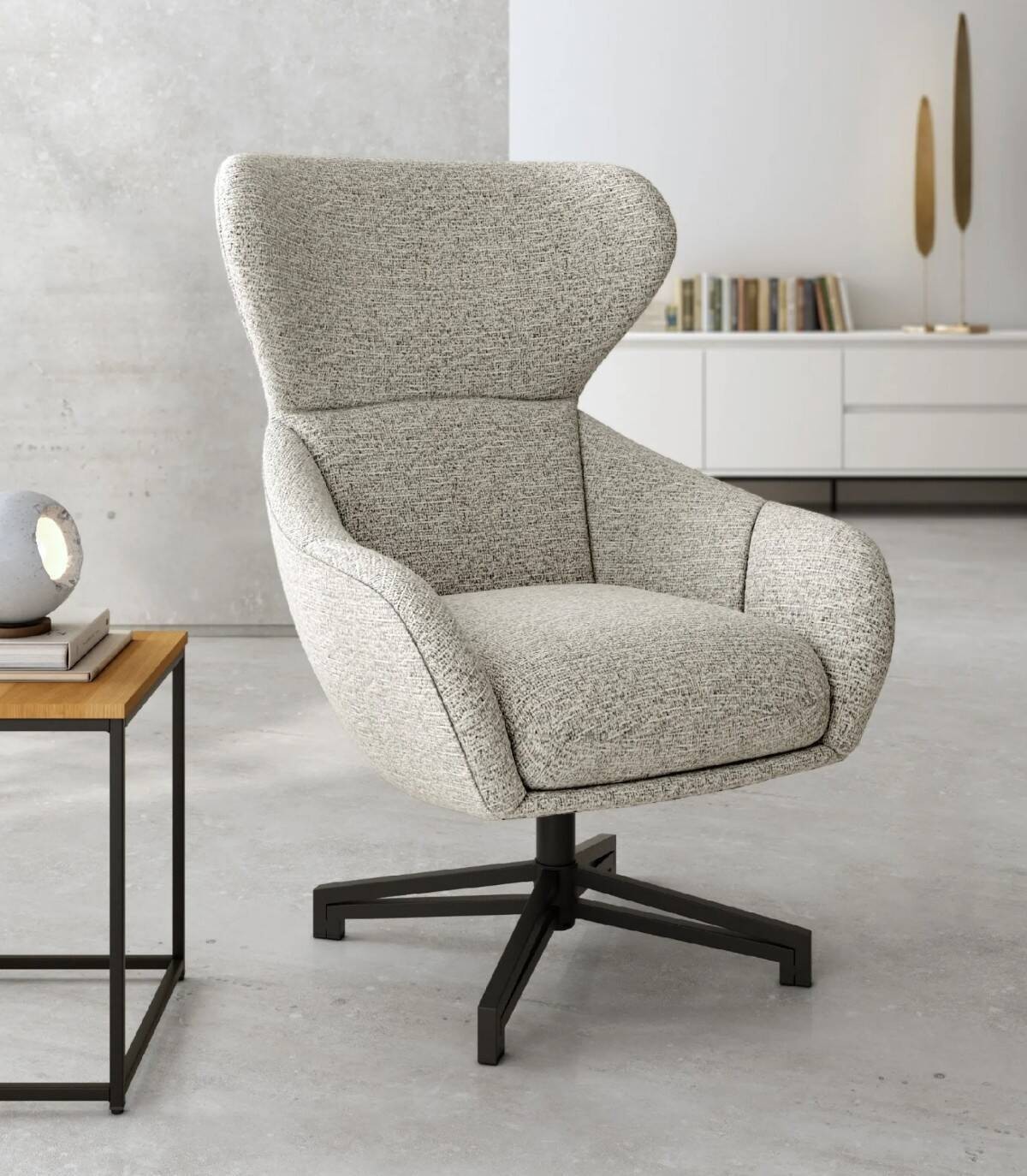 La butaca Abelia giratoria 360 grados se compone de asiento, respaldo, reposabrazos tapizados y una pata giratoria central con soporte en forma de cruz metálica pintada de color negro.