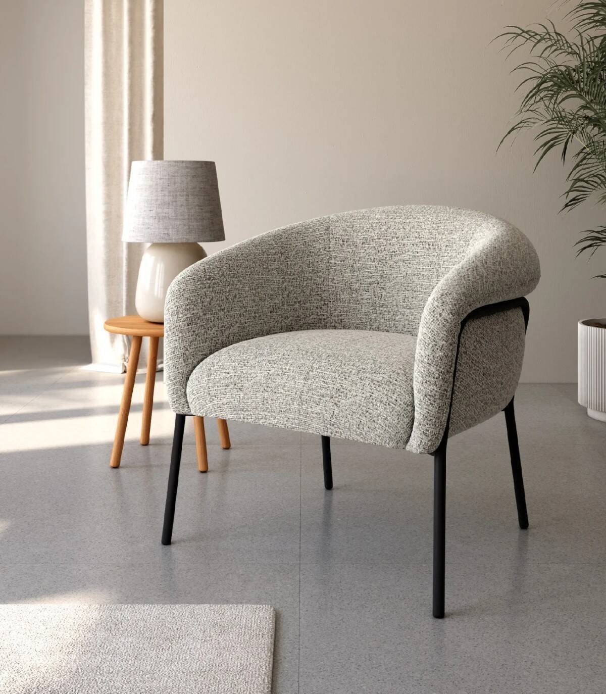 La butaca Rose se compone de asiento, respaldo, reposabrazos tapizados en forma de semicirculo y cuatro patas metálicas pintadas de color negro.