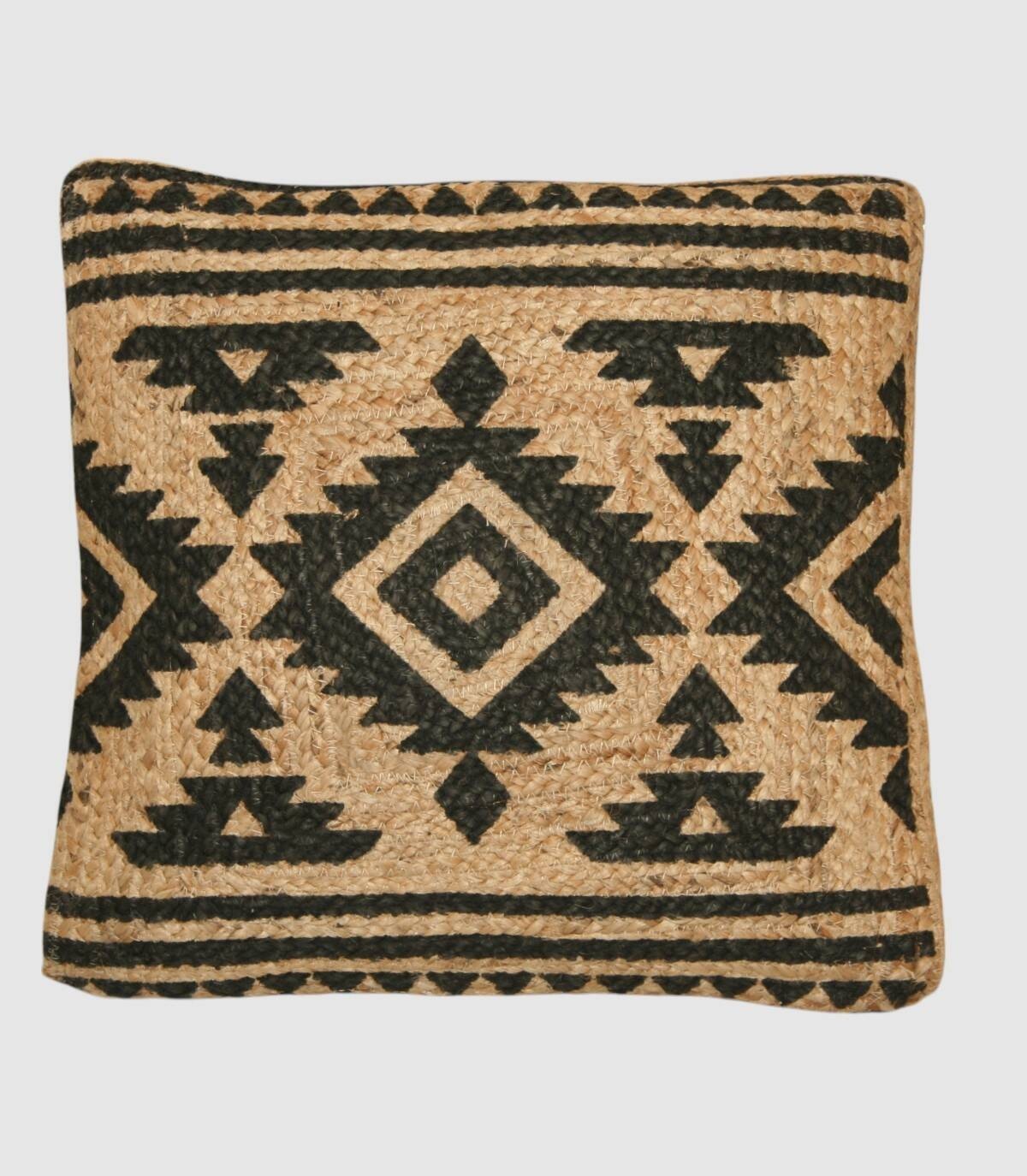 Cojín para decoración hecho de yute con dibujo de rombo negro.