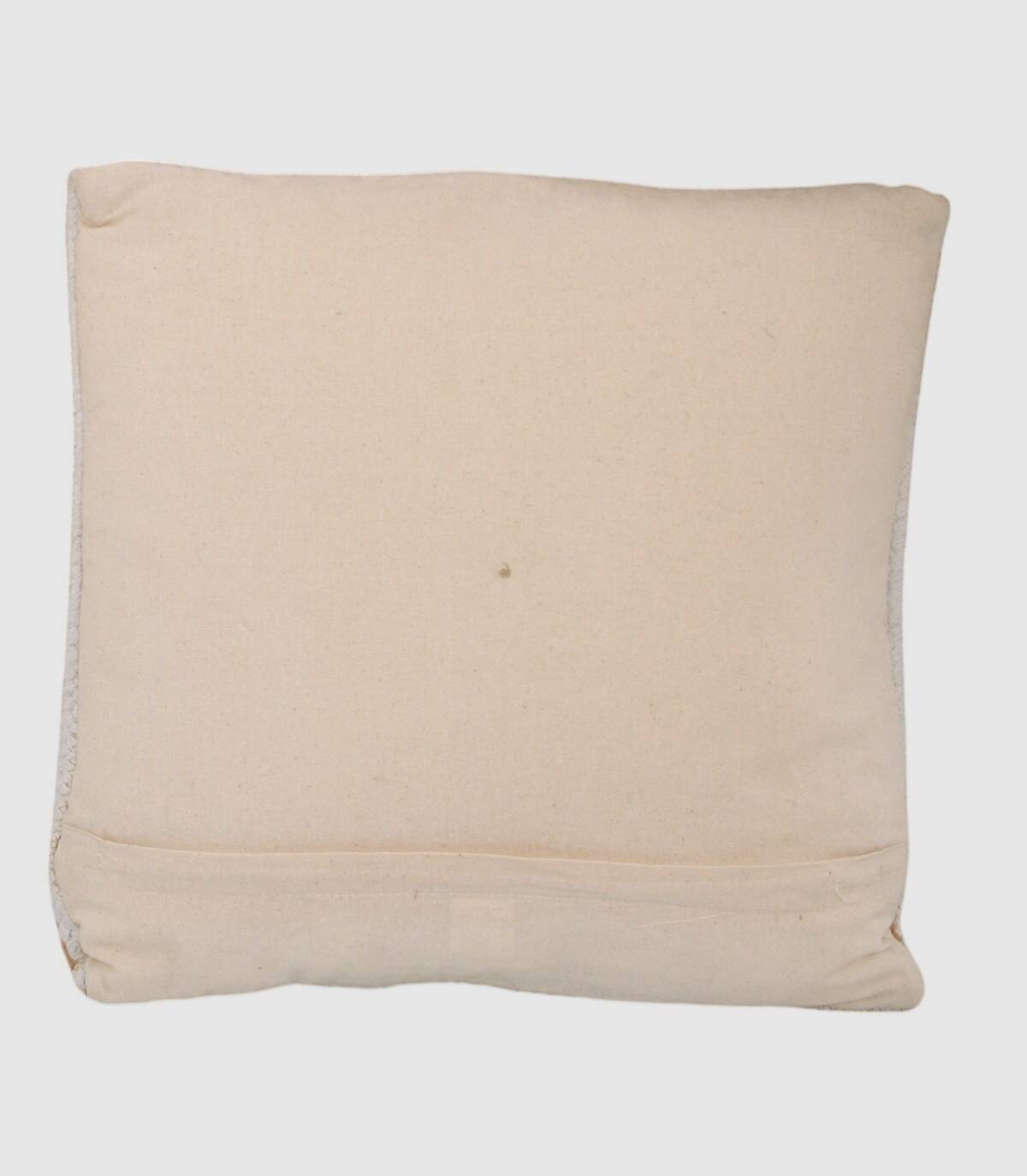 Cojín para decoración hecho de yute con dibujo de espiral blanco.