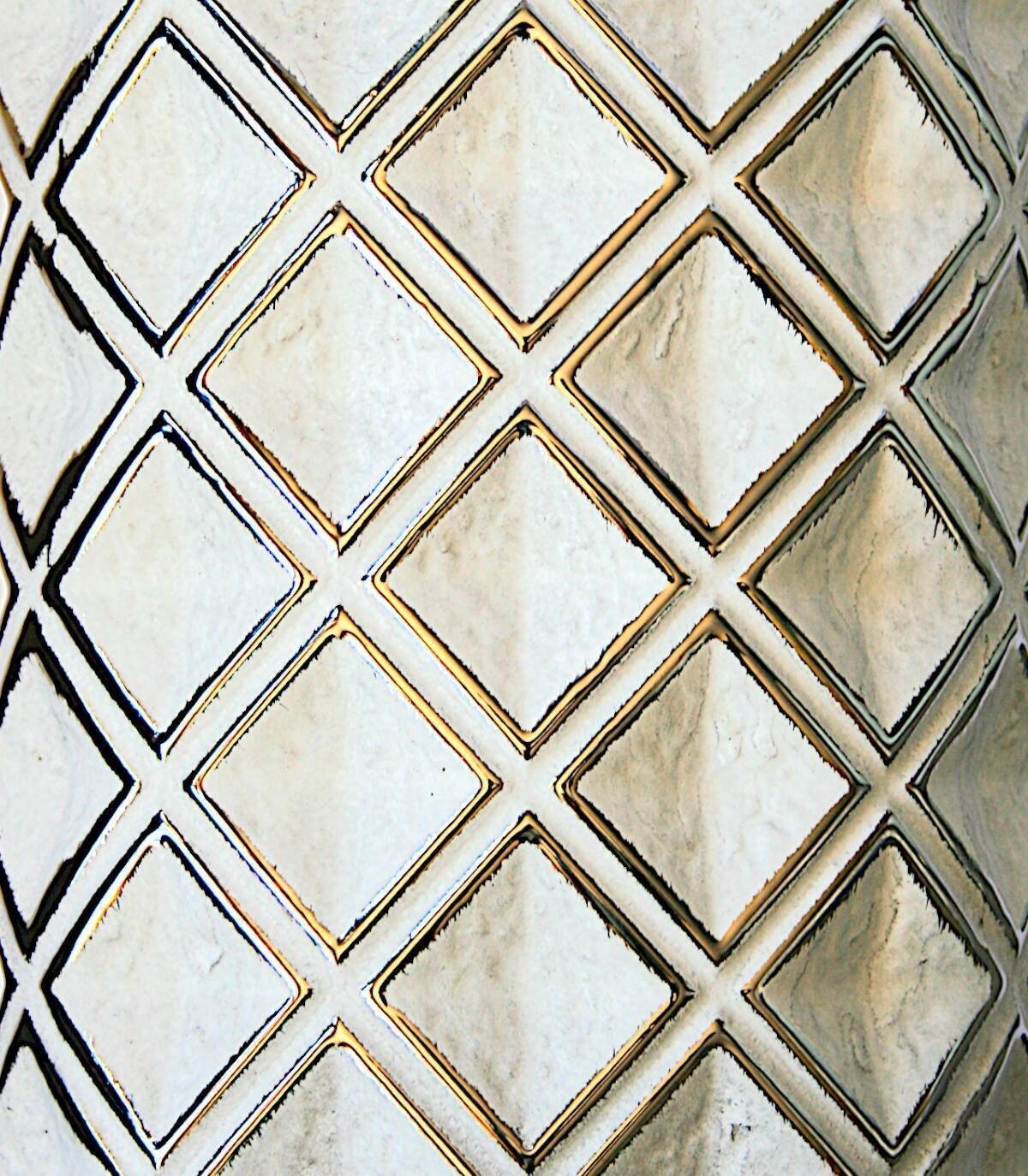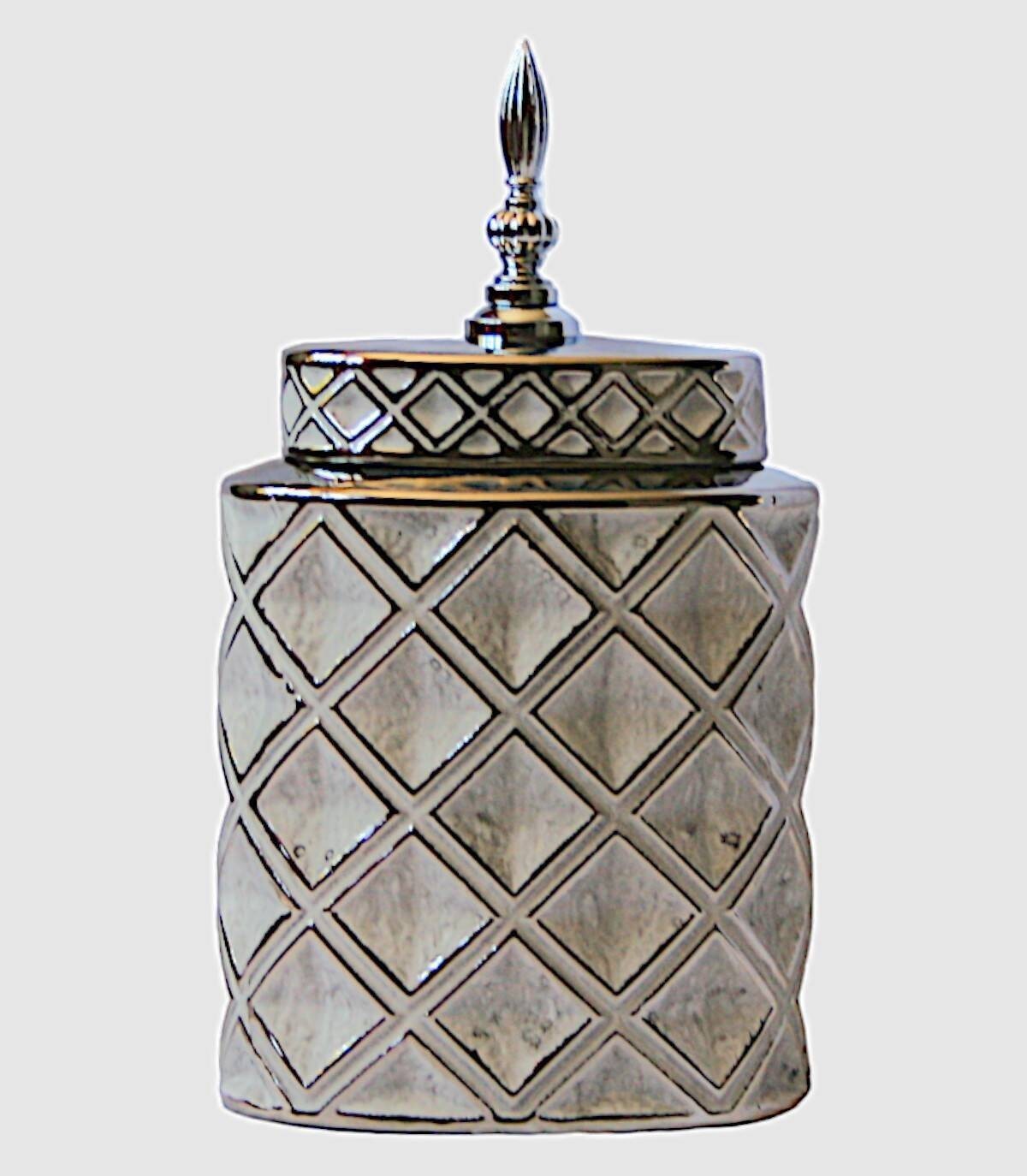 Tibor plateado blanco pequeño con tapa, con relieve de rombos, compuesto de cerámica con una pieza de metal en la tapa.
