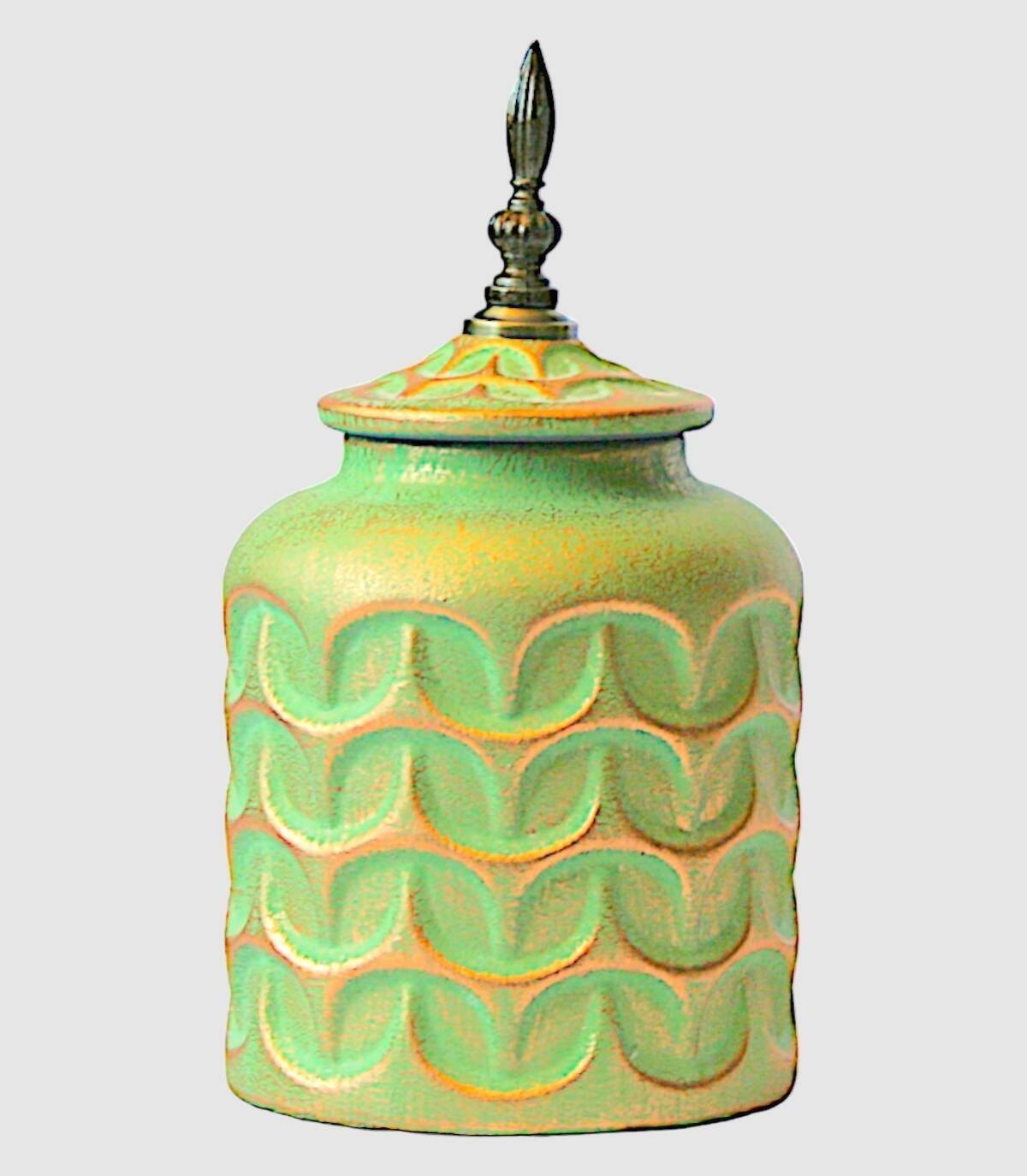 Tibor verde y dorado pequeño con tapa compuesto de cerámica y una pieza de metal en la tapa.