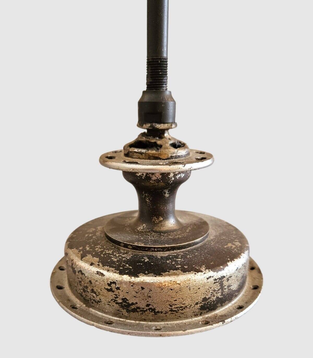 Decoración para mesas compuesta por una madera rectangular con agujeros y pie de metal con forma de engranaje. Siendo un producto artesanal las formas y las medidas de la madera son indicativas, cada producto es diferente y único.