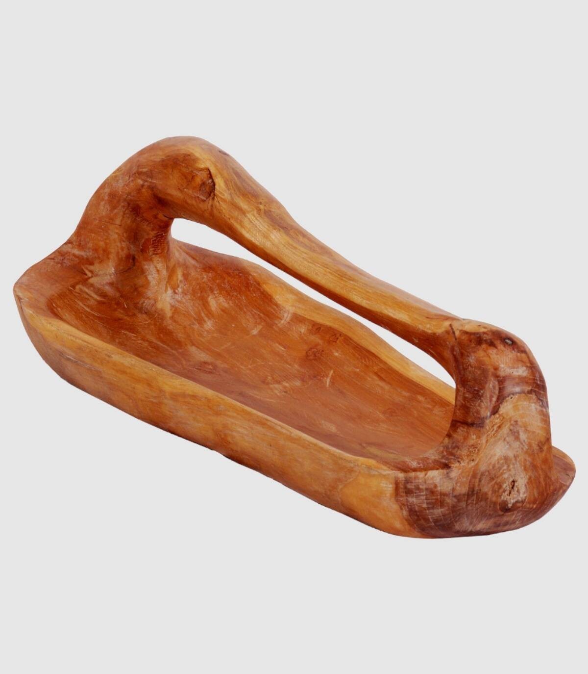 Cuenco de madera de teca alargado con asa.