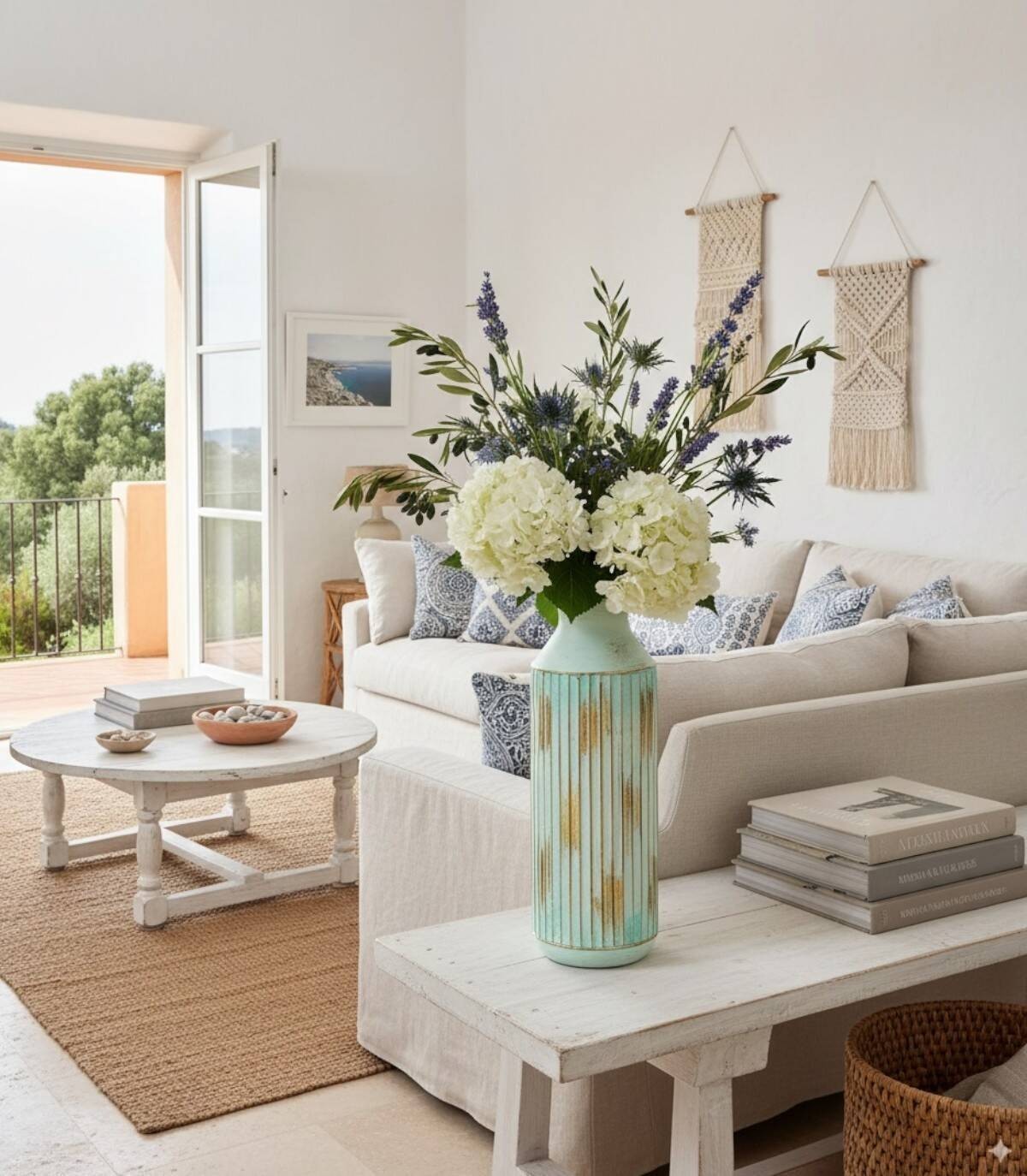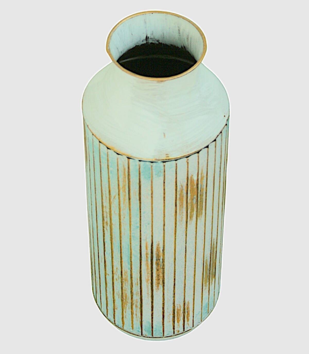 El jarrón se compone de metal pintado de color blanco, dorado y azul con lineas verticales en relieve.