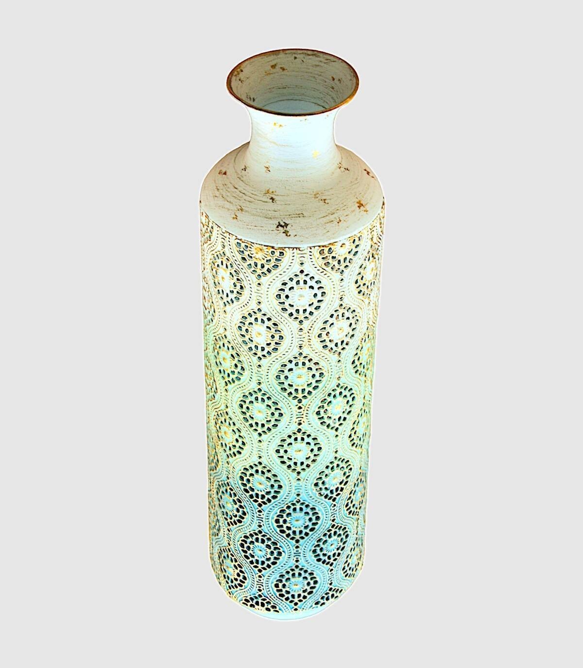 Jarrón pequeño compuesto de metal pintado de color blanco y azul con efecto envejecido en color dorado, con perforaciones y dibujos en dorado.