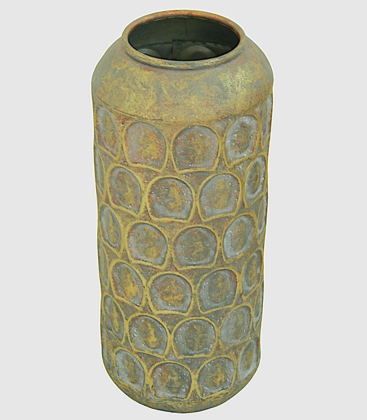 El jarrón se compone de metal de color oro envejecido con dibujos de formas circulares en relieve.