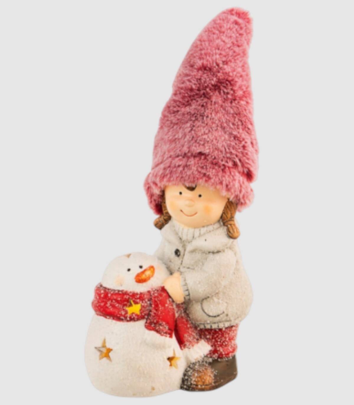 Figura de niña con muñeco de nieve con agujeros en forma de estrellas con luz en su interior.