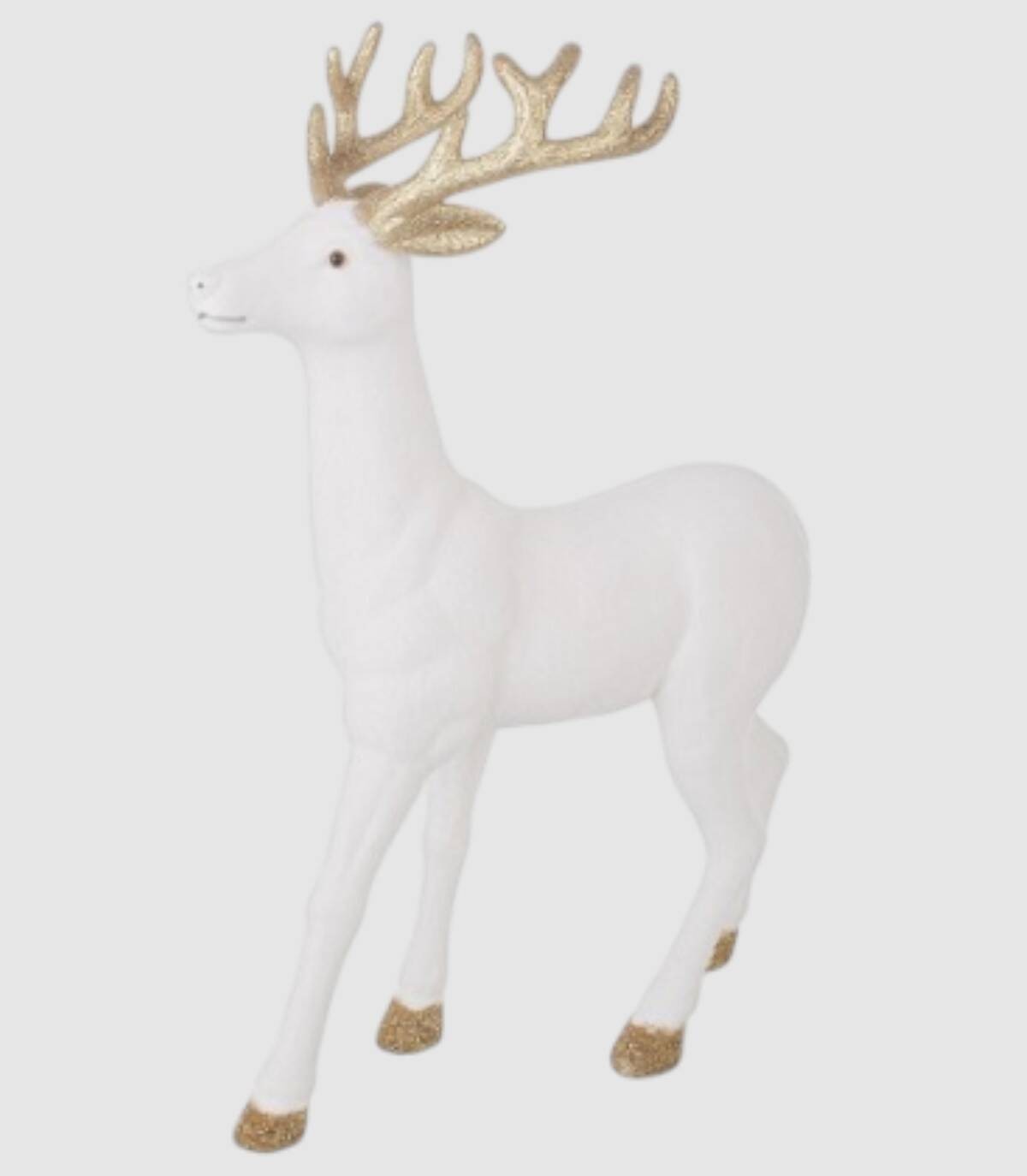 Figura con forma de reno de color blanco y dorado con efecto purpurina de 45 centímetros de alto por 30 centímetros de largo.