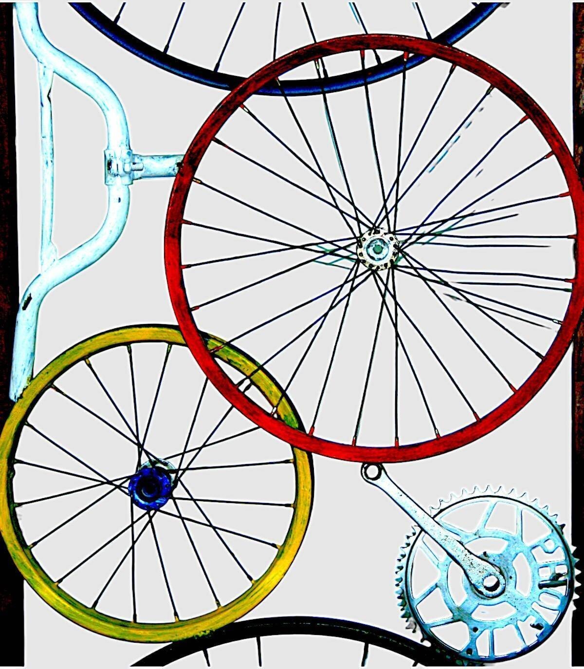 Marco de madera con soporte para mantenerse de pie con ruedas y partes de bicicletas decorativas