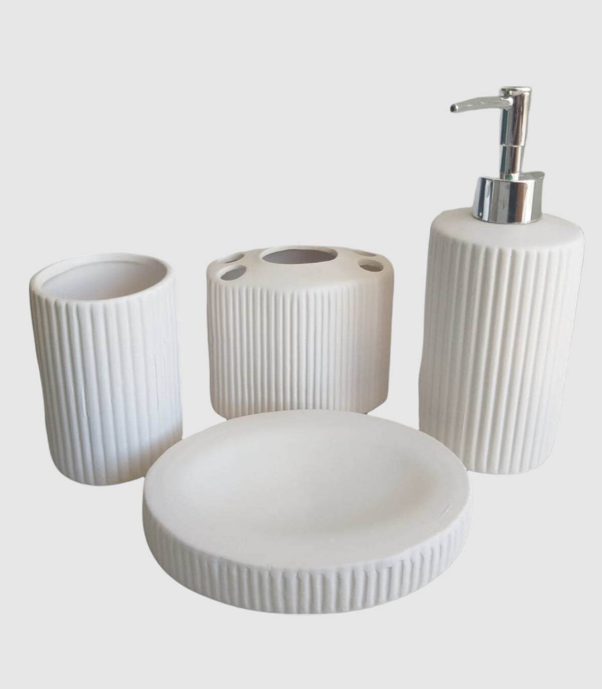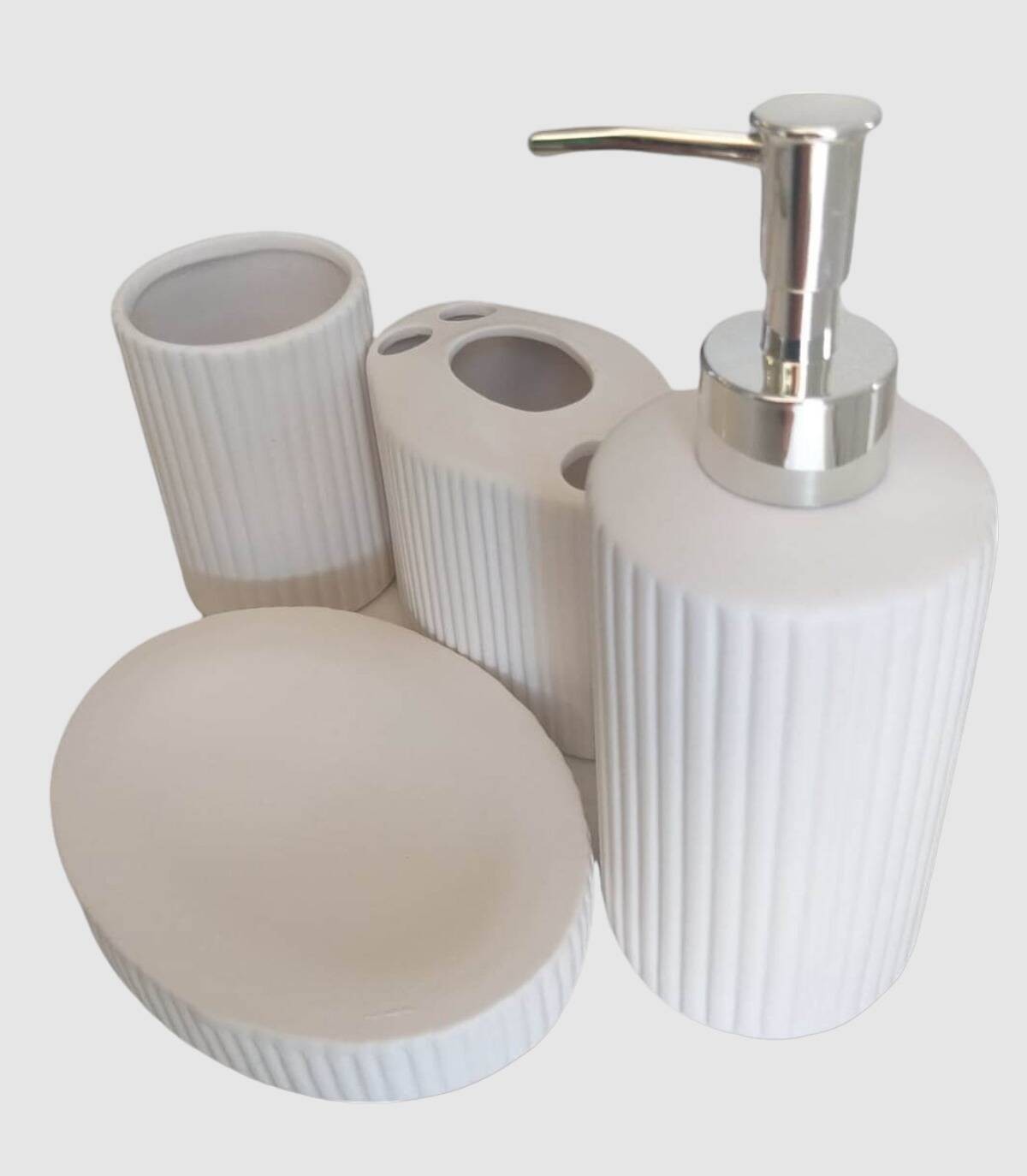 Set of 20x7cm dispenser, 11x7.5cm toothbrush holder, 10x7cm glass and 15x11cm soap dish in black ceramic
