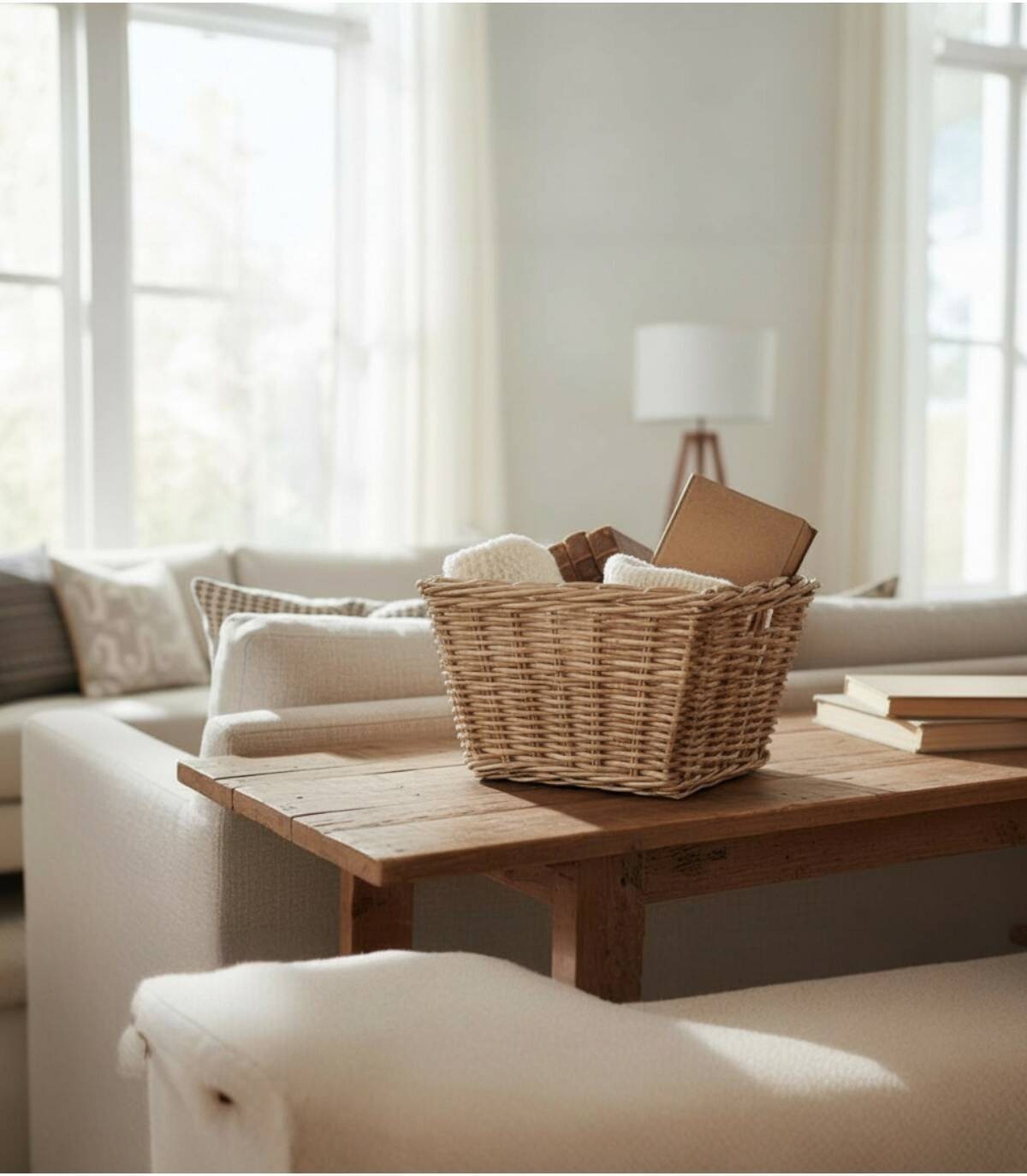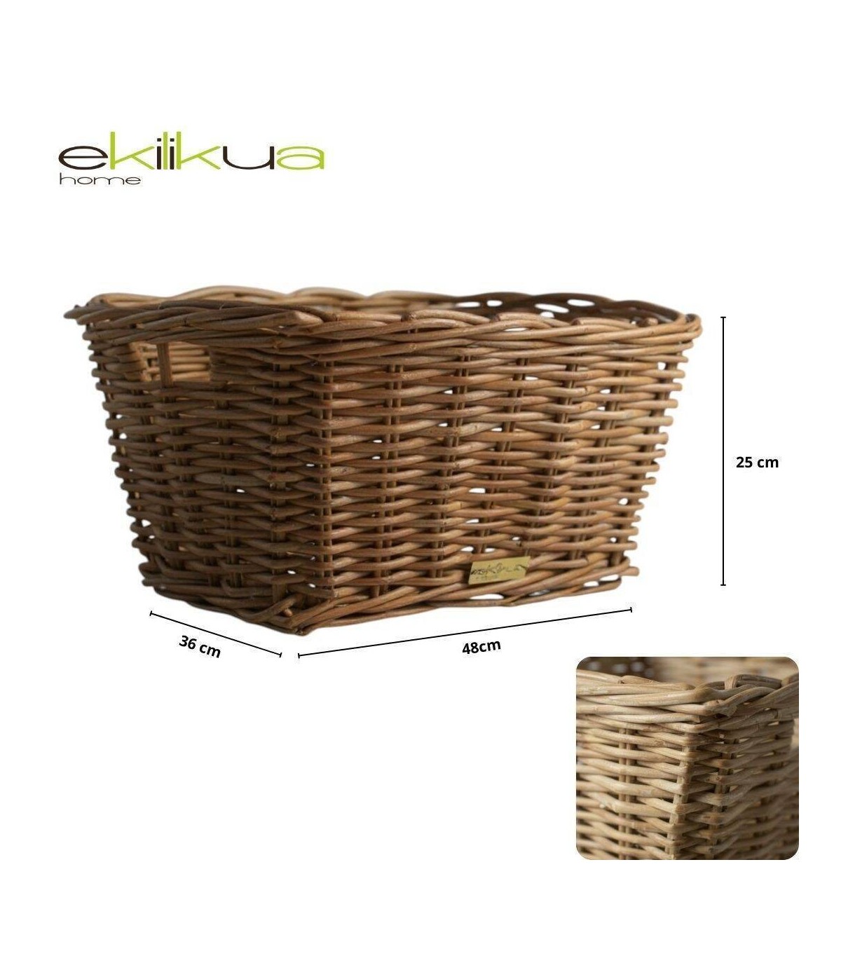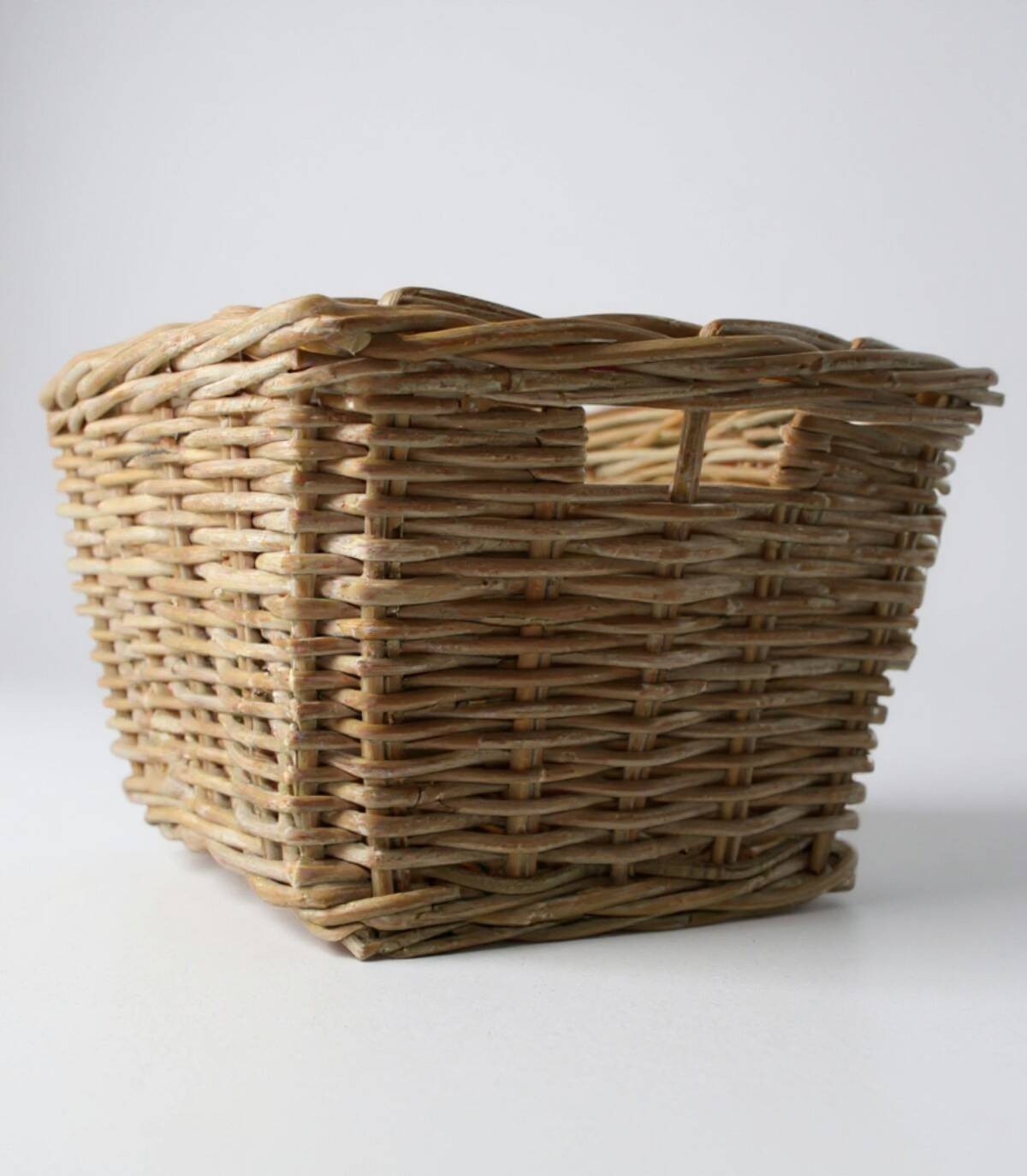 Read moreShow lessrectangular made of natural color rattan with handles.