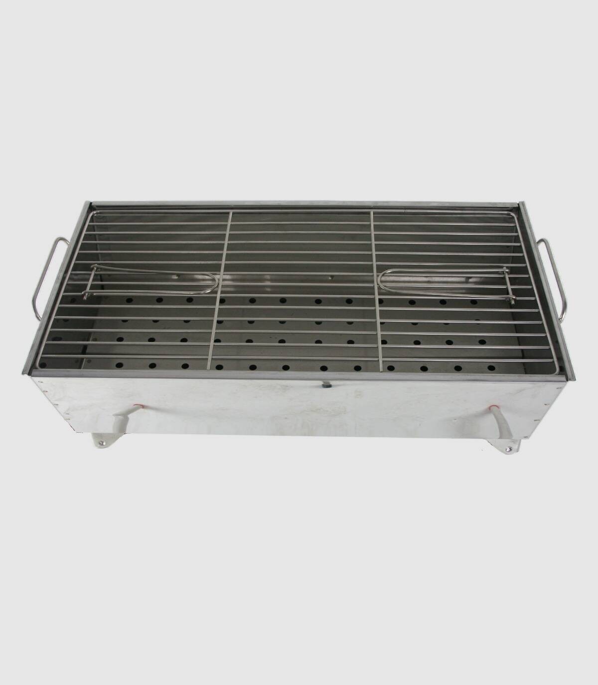 It consists of a rectangular box with handles, a grill with handles and legs with non-slip caps. It has a side cover that allows you to clean the bottom of the grill. The legs are foldable for a more comfortable transport.