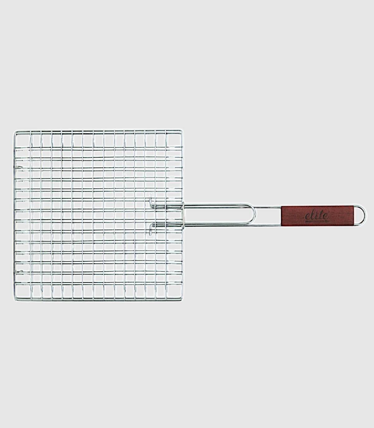 Parrilla de tamaño mediano con mango visagras para abrir y cierre para asar comida en la barbacoa de forma comoda. Superficie de cocinado 28 x 28 cm.