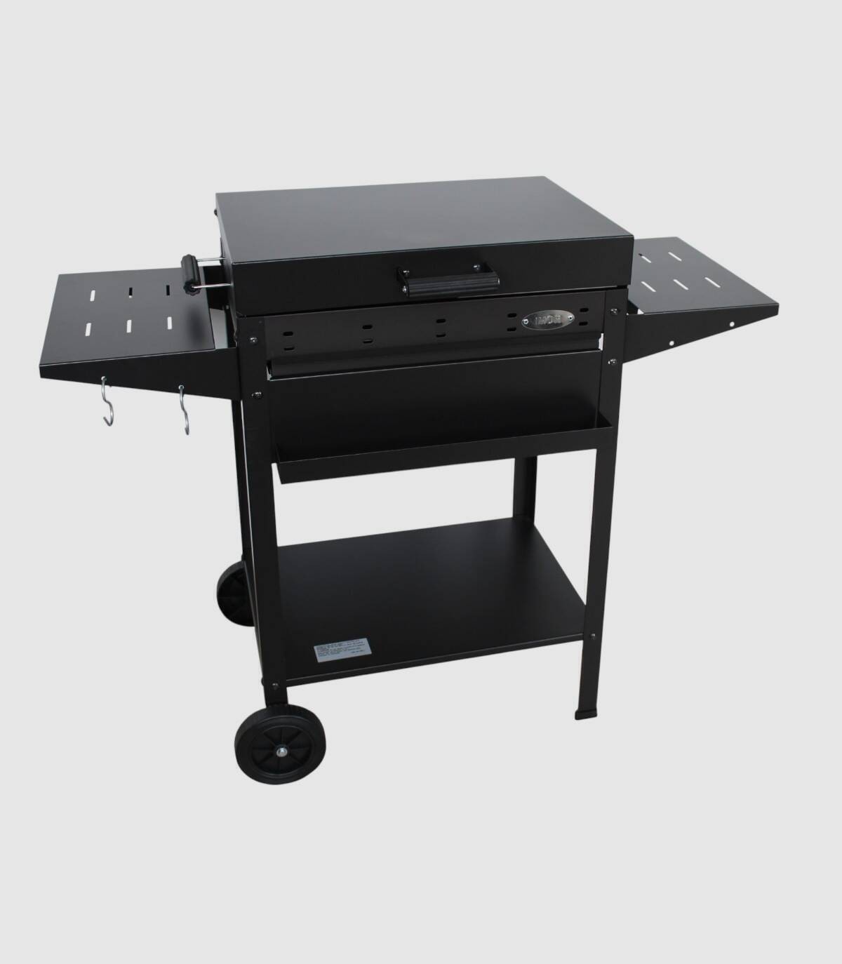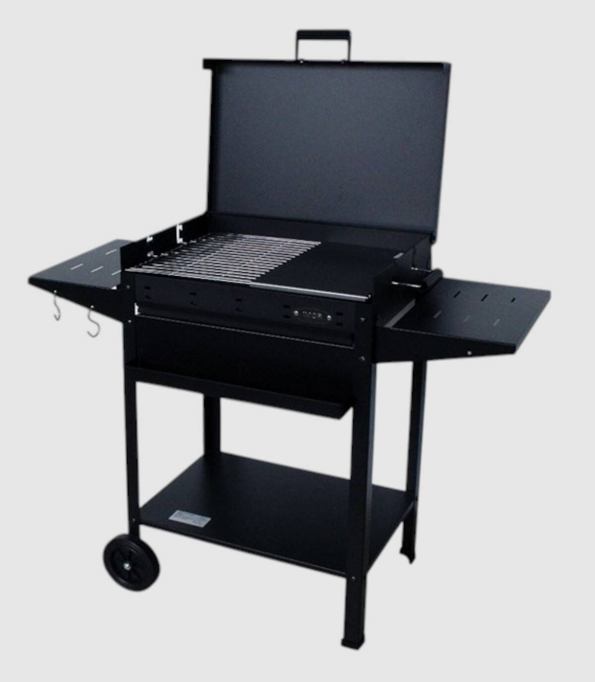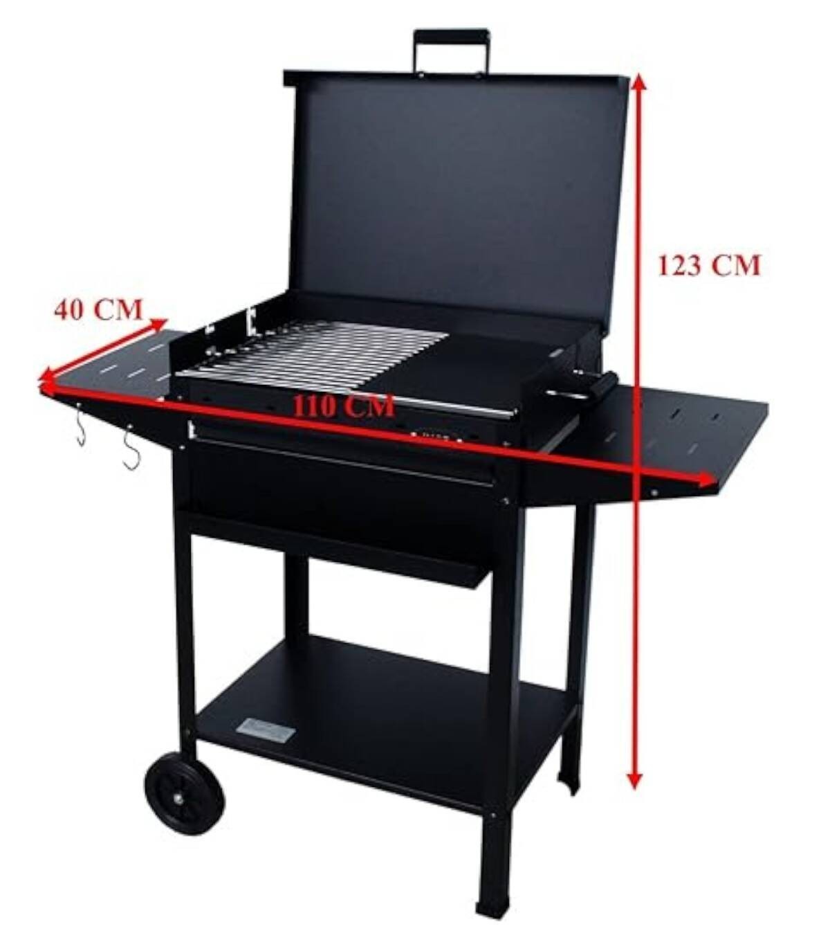 La barbacoa Mallorca con ruedas se compone de quemador de carbón parrilla regulable en tres alturas de acero inoxidable, plancha,tapa con asa y tres bandejas.