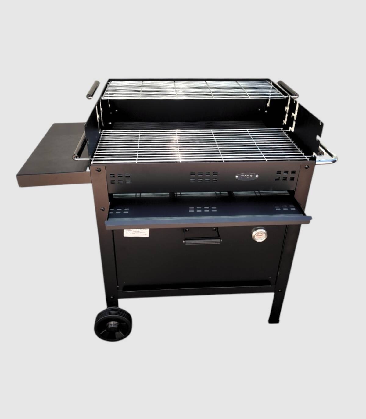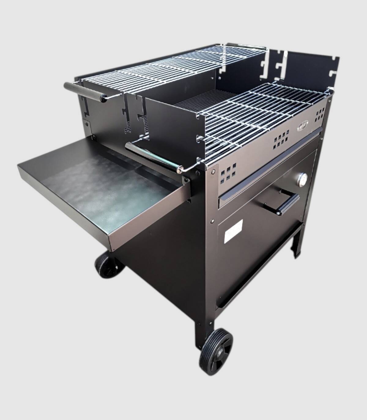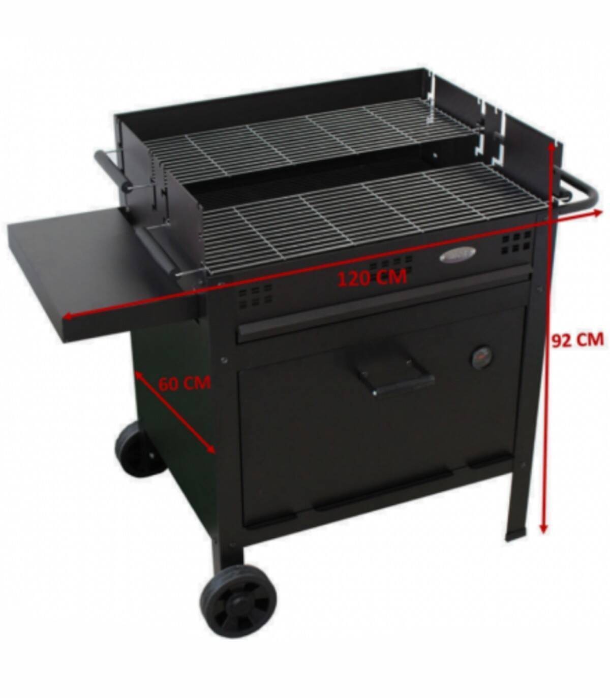 La barbacoa Etna V20 con ruedas se compone de quemador de carbón o leña con ladrillos refractarios, parrilla regulable en tres alturas de acero inoxidable con dos bandejas y triador.
