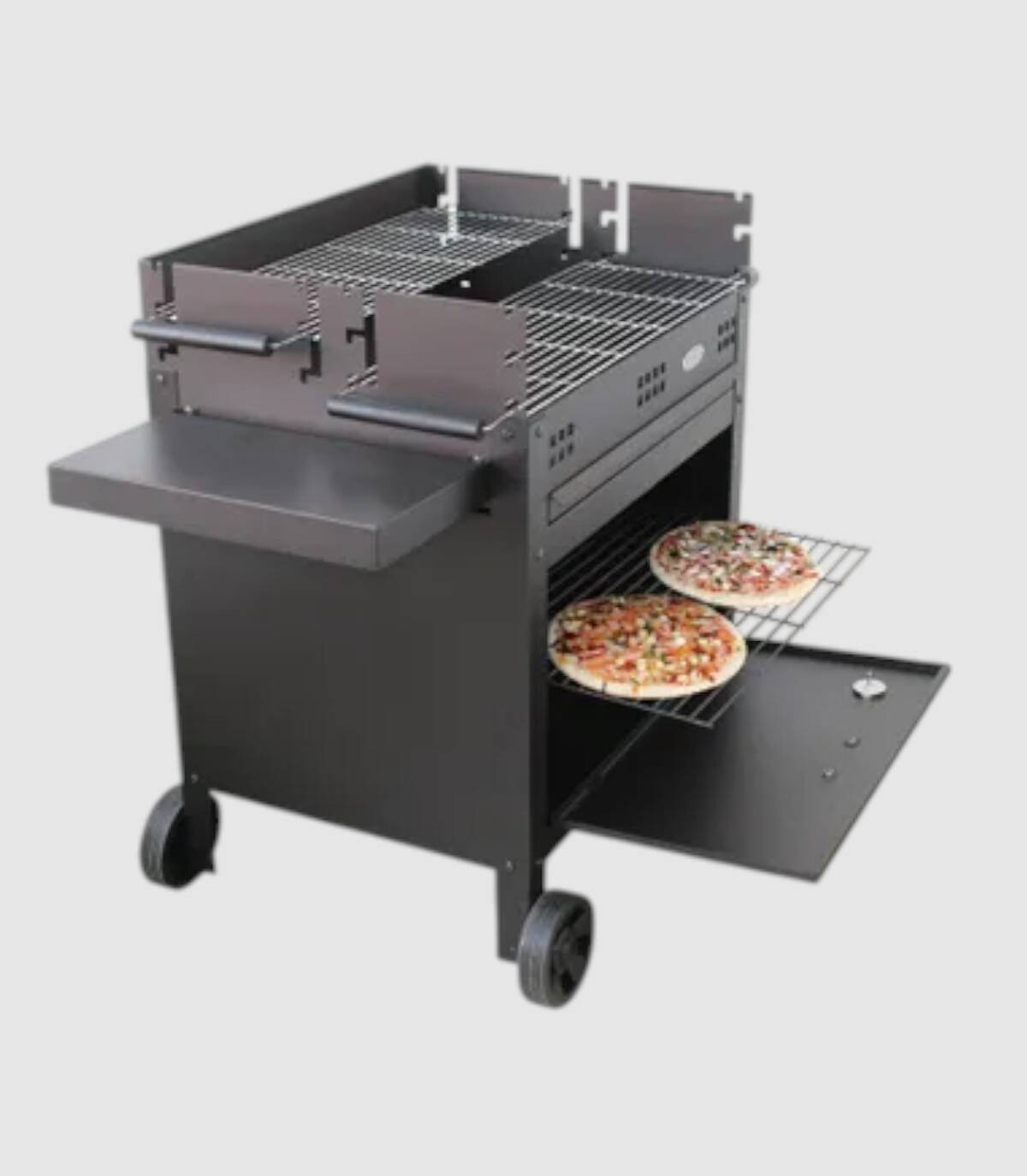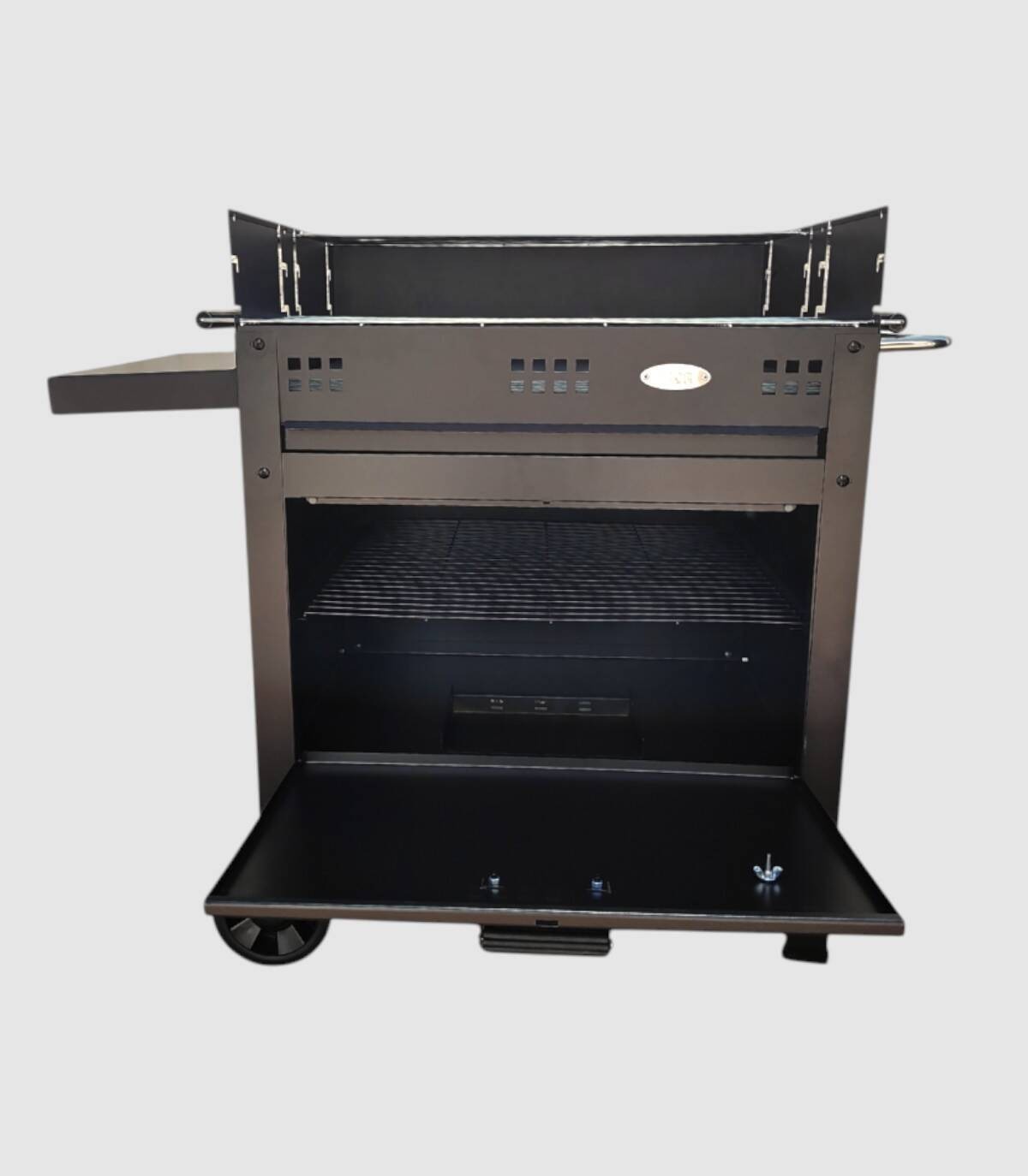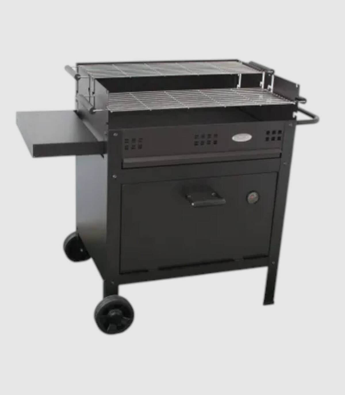 La barbacoa Etna V20 con ruedas se compone de quemador de carbón o leña con ladrillos refractarios, parrilla regulable en tres alturas de acero inoxidable con dos bandejas y triador.