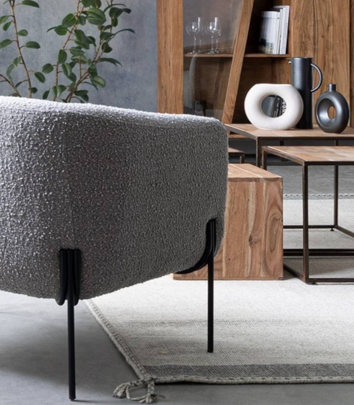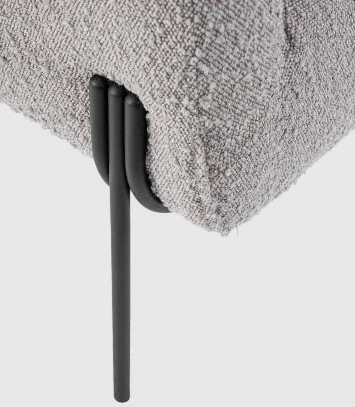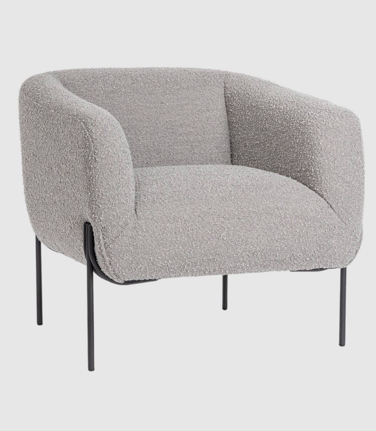 The gray Claudine armchair plywood structure, epoxy powder coated steel legs, loop effect polyester coating, seat filling density 28kg/m3, backrest 20kg/m3. Not removable cover. The legs require assembly.