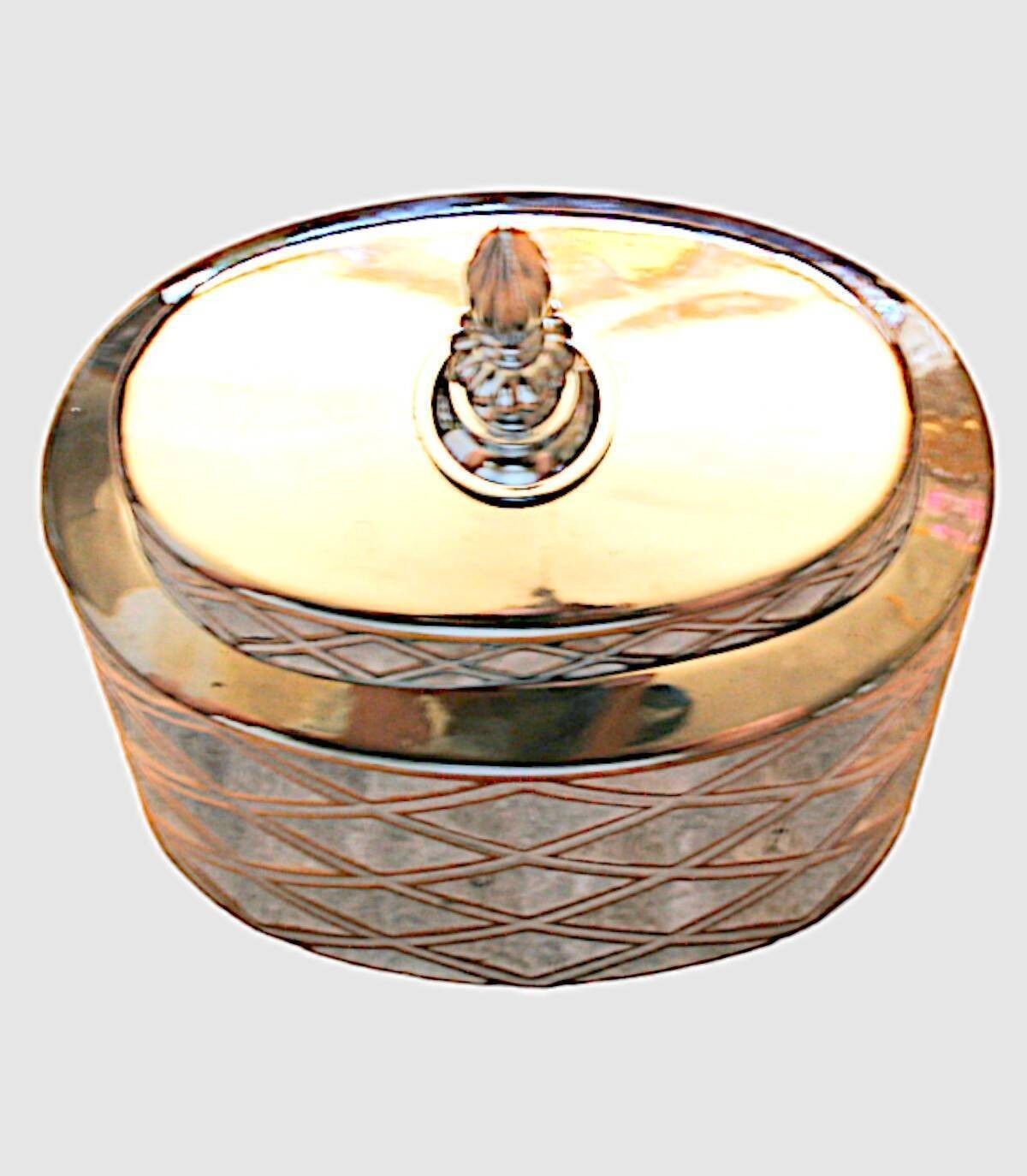 Read moreShow lesssmall with lid, with rhombus relief, made of ceramic with a metal piece on the lid.