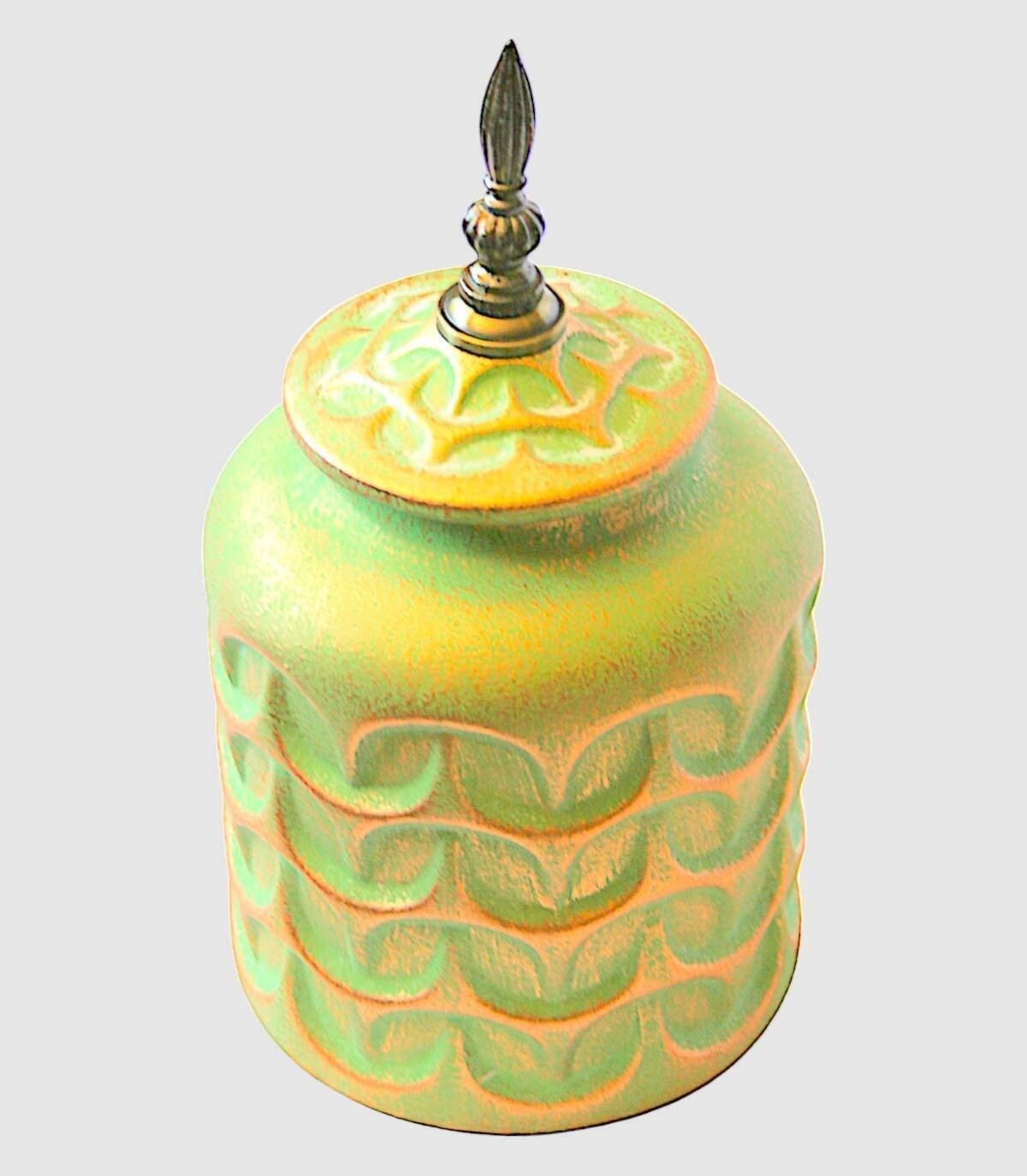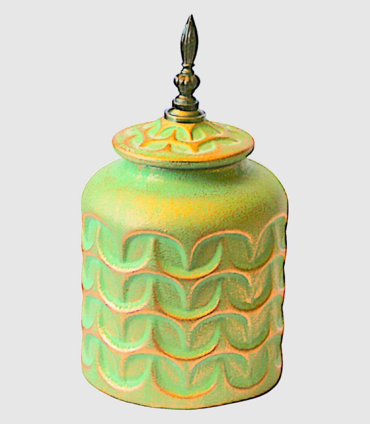 Green and gold tibor small with ceramic composite lid and a metal piece on the lid.