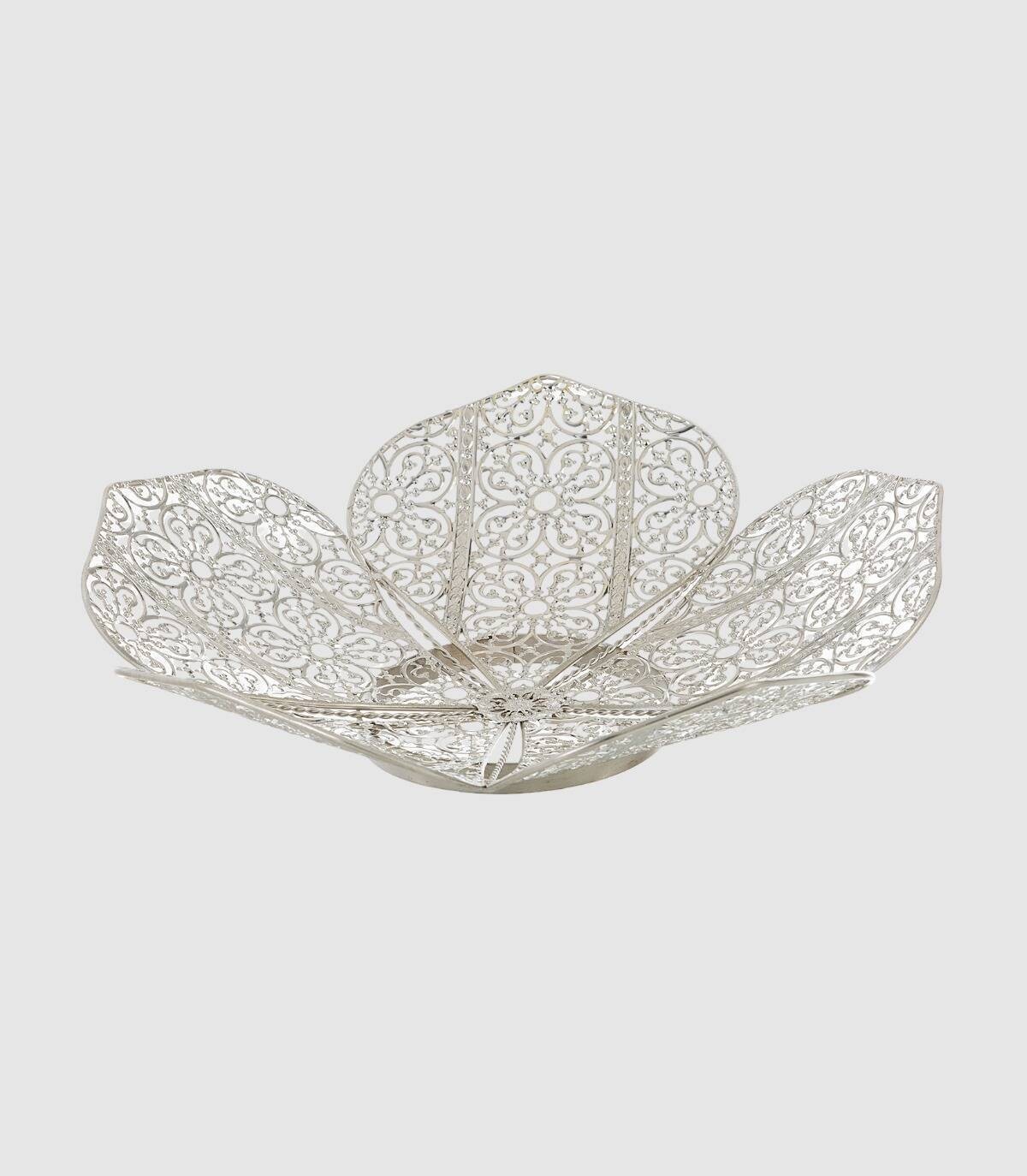 This flower-shaped plate to decorate is made of metal with perforations that form patterns on the surface.