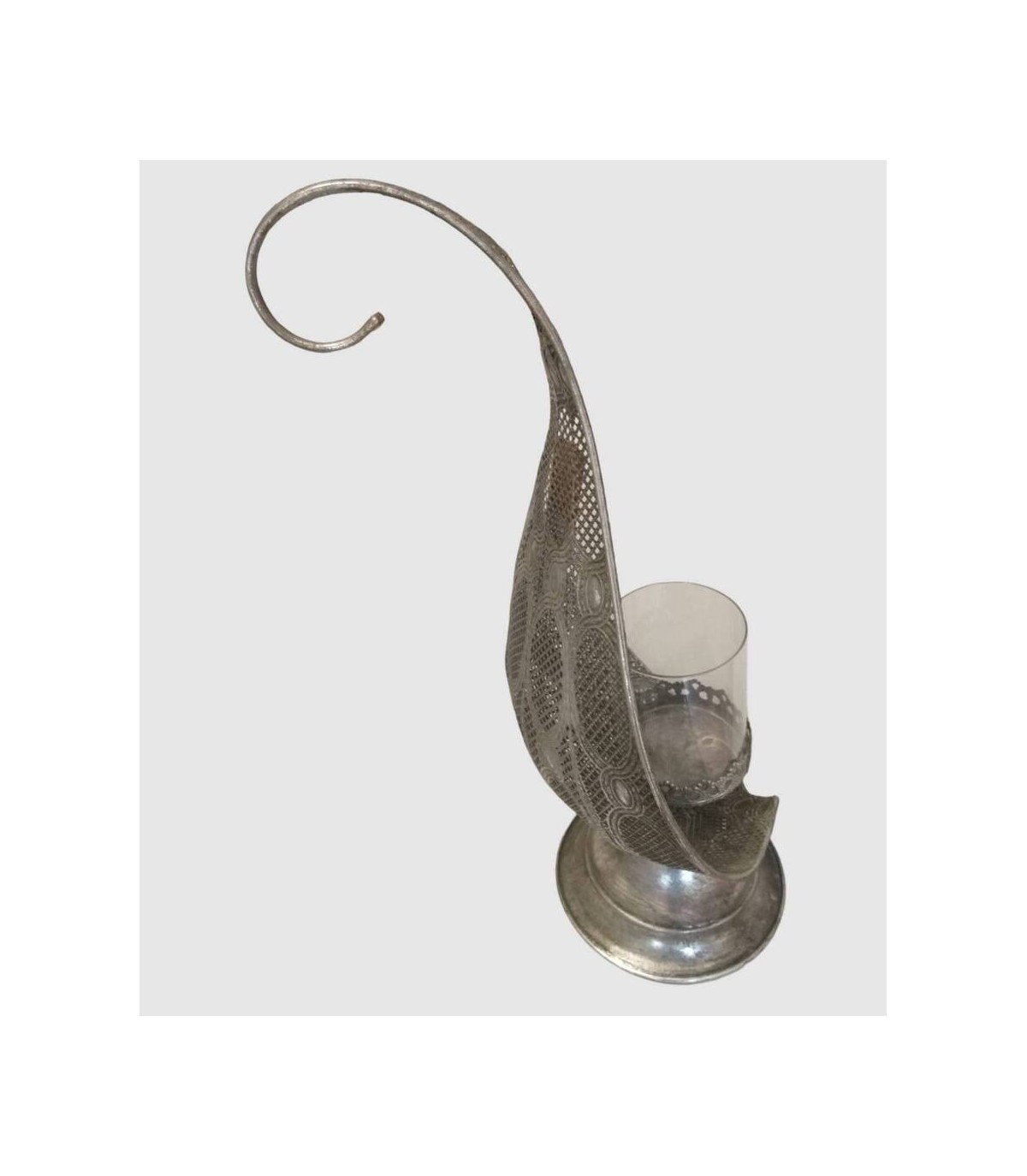 Metal lantern with a semicircular shape carved with drawings and a glass vase. It has measurements of 57x28x19 centimeters.