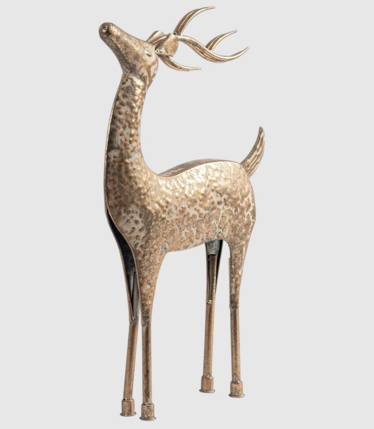 Figura de navidad de reno levantado compuesto de metal de color oro de 41 centímetros de ancho por 69 centímetros de alto.