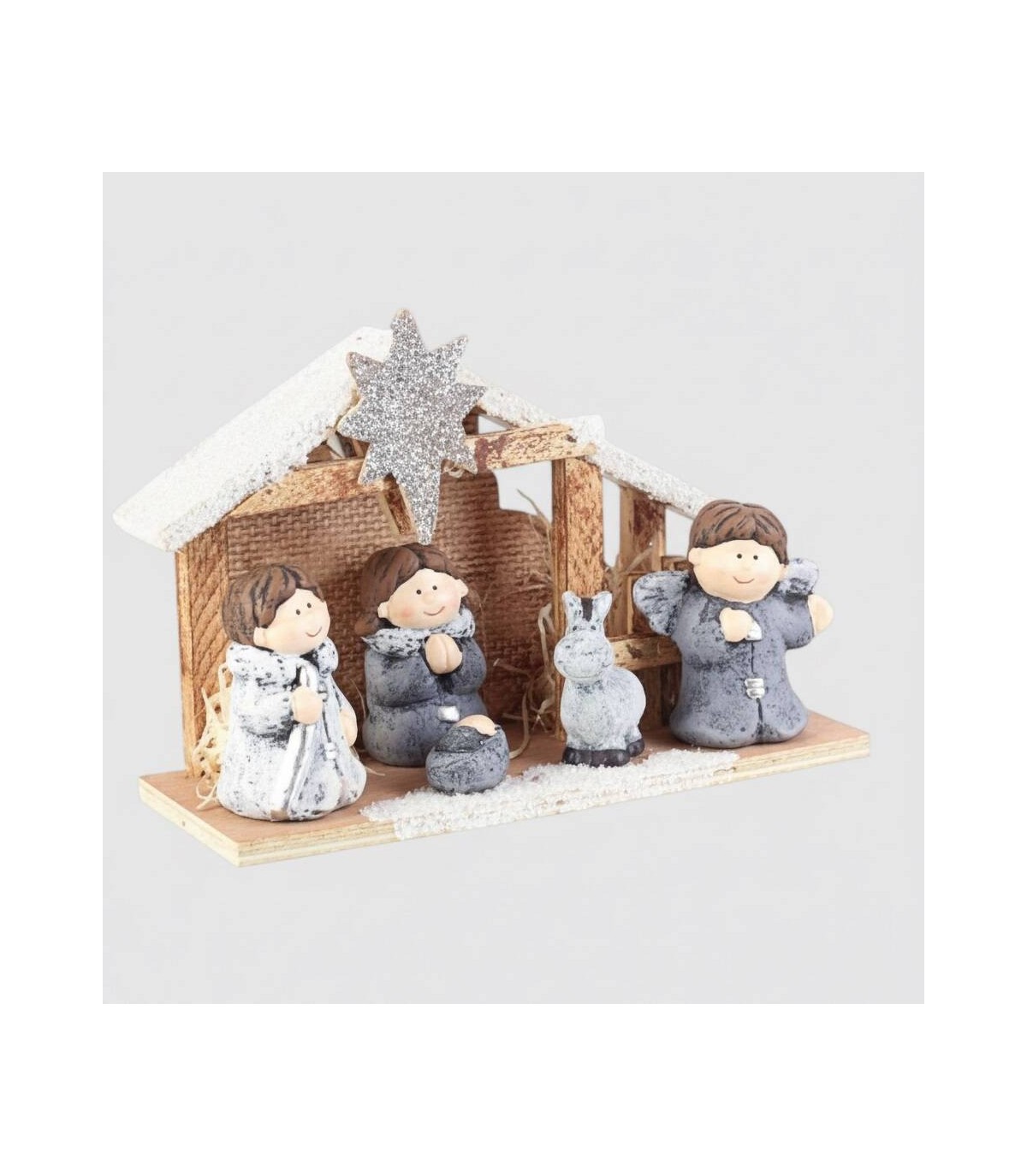 Figura de belen Holiness compuesto por cabaña de madera y personajes de cerámica.