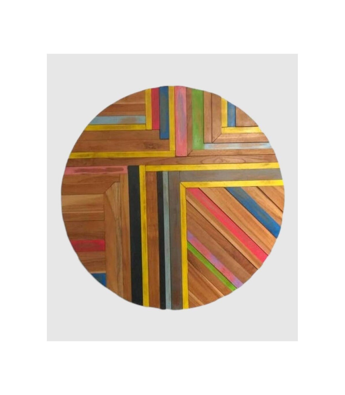 ROUND WOODEN PICTURE. It has a surface of 80 cm, it is painted piece by piece, ideal for smooth walls in which it stands out for its current colors. It has measurements of 80x80x2 centimeters.