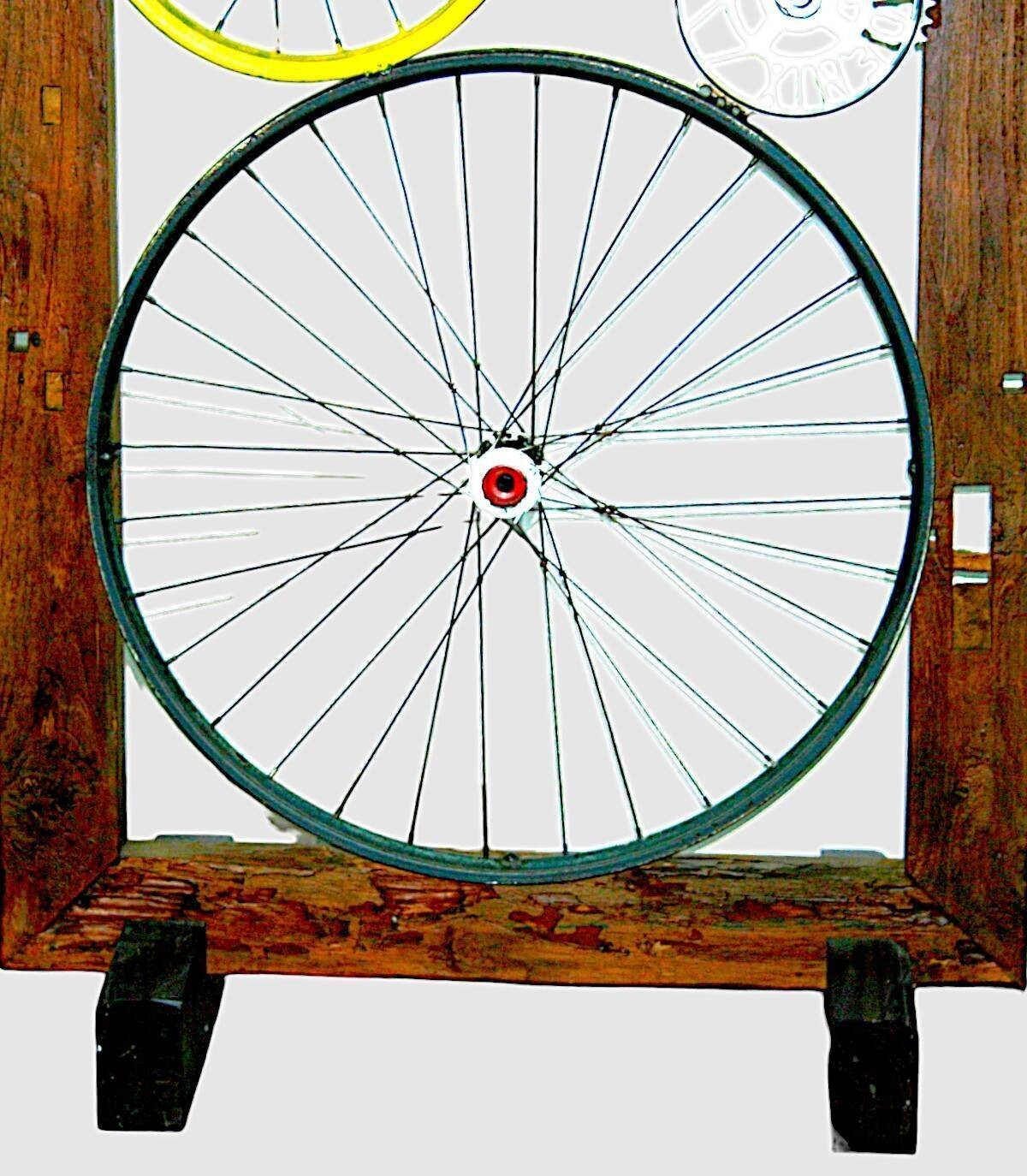 Wooden stand frame with wheels and decorative bicycle parts