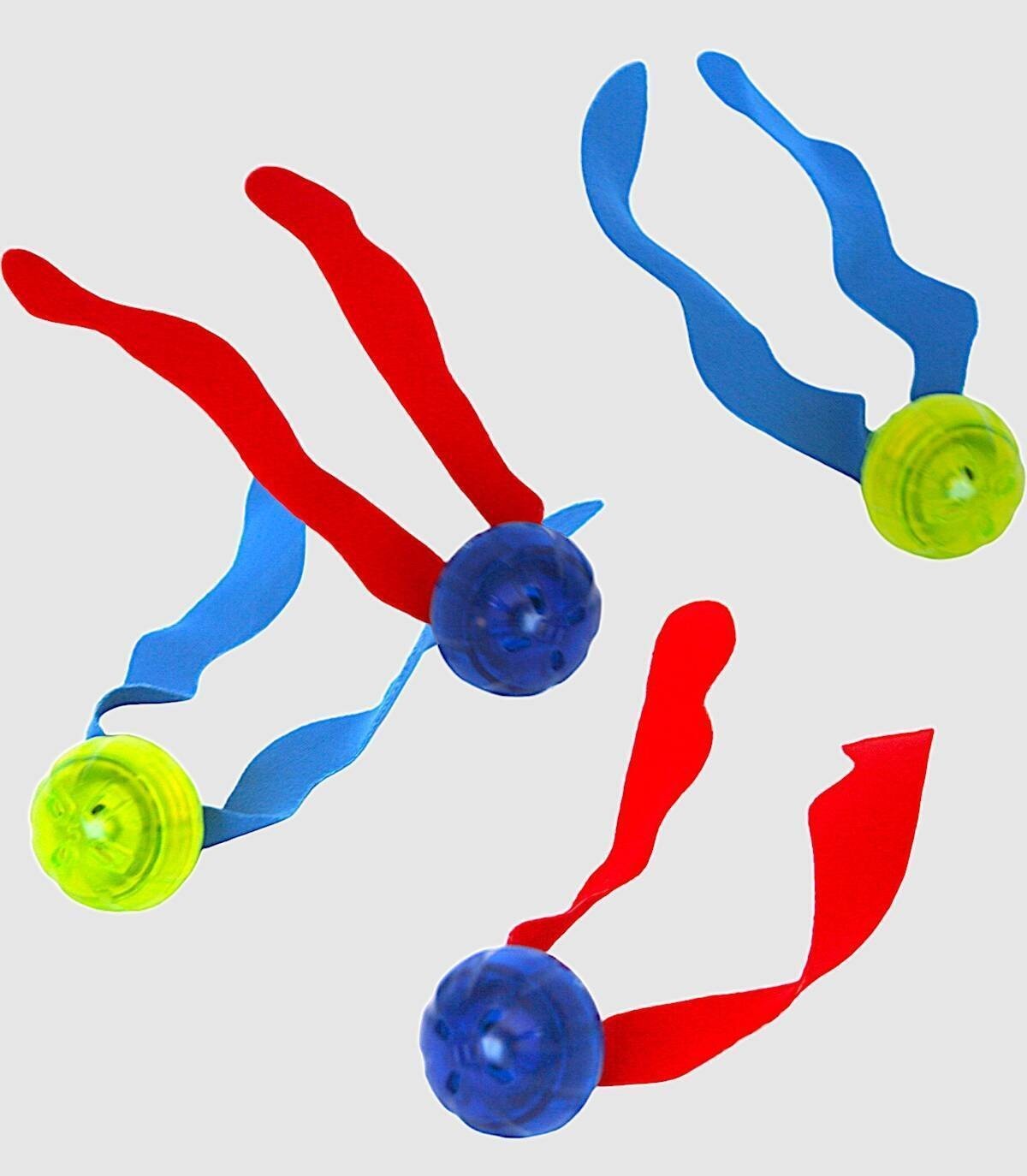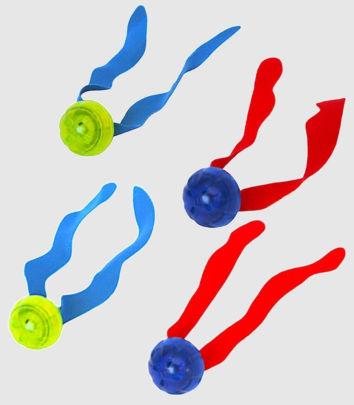 Set of four luminous balls with fabric ribbons to play diving in the pool of two colors: blue and red or green and blue. They light up when they hit the water.