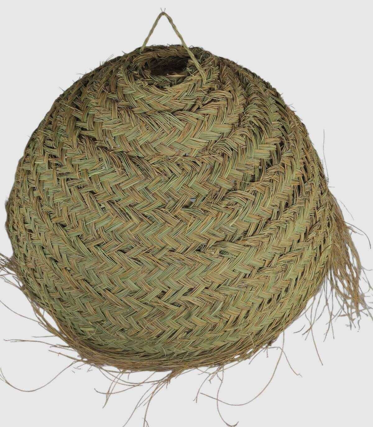 Esta lámpara redonda calada hecha artesanalmente de esparto da un toque étnico en cualquier sitio donde se instale ,cambia de color según el uso si se usa en el exterior cambiando a un color mas amarillo.