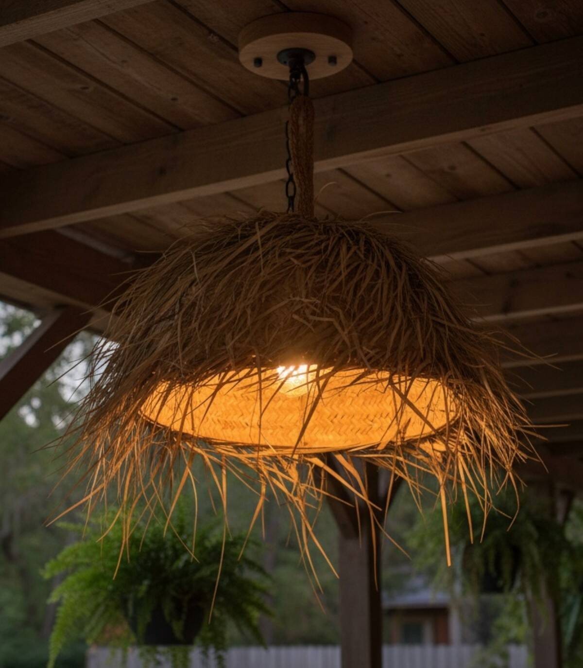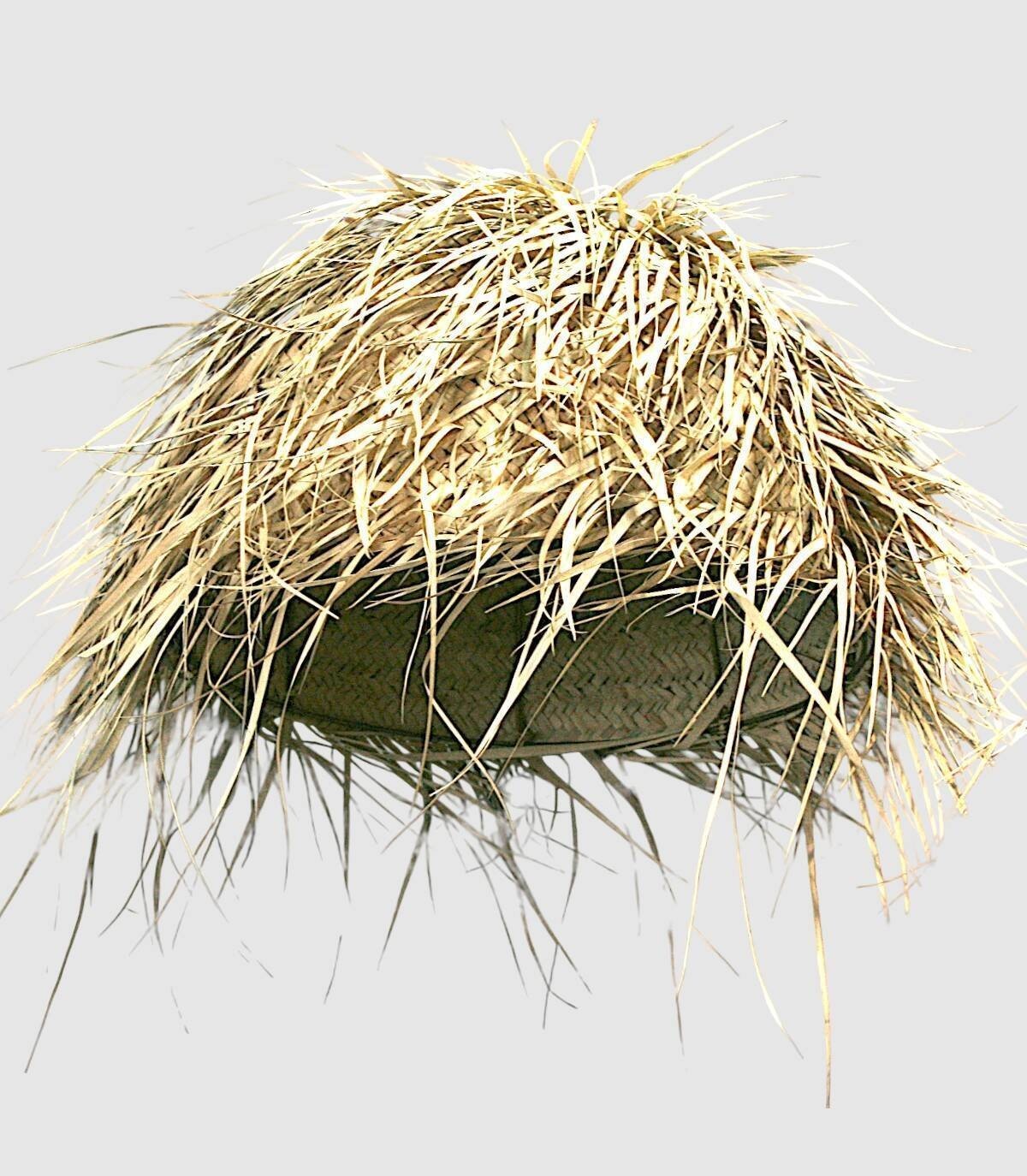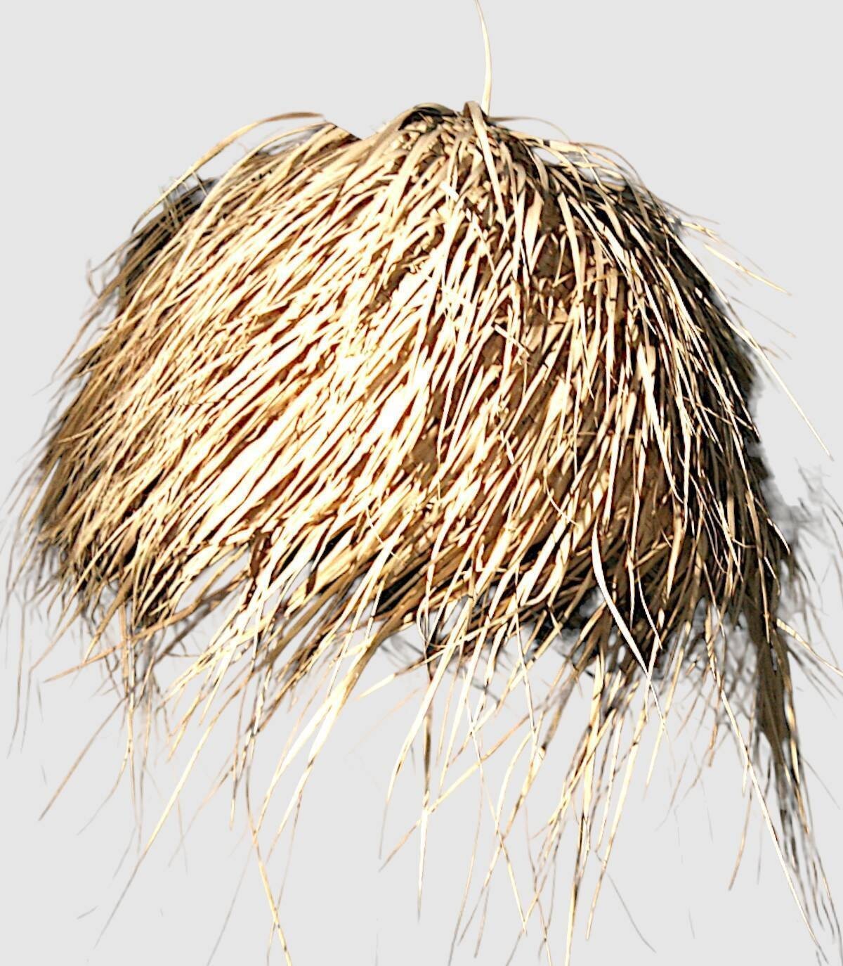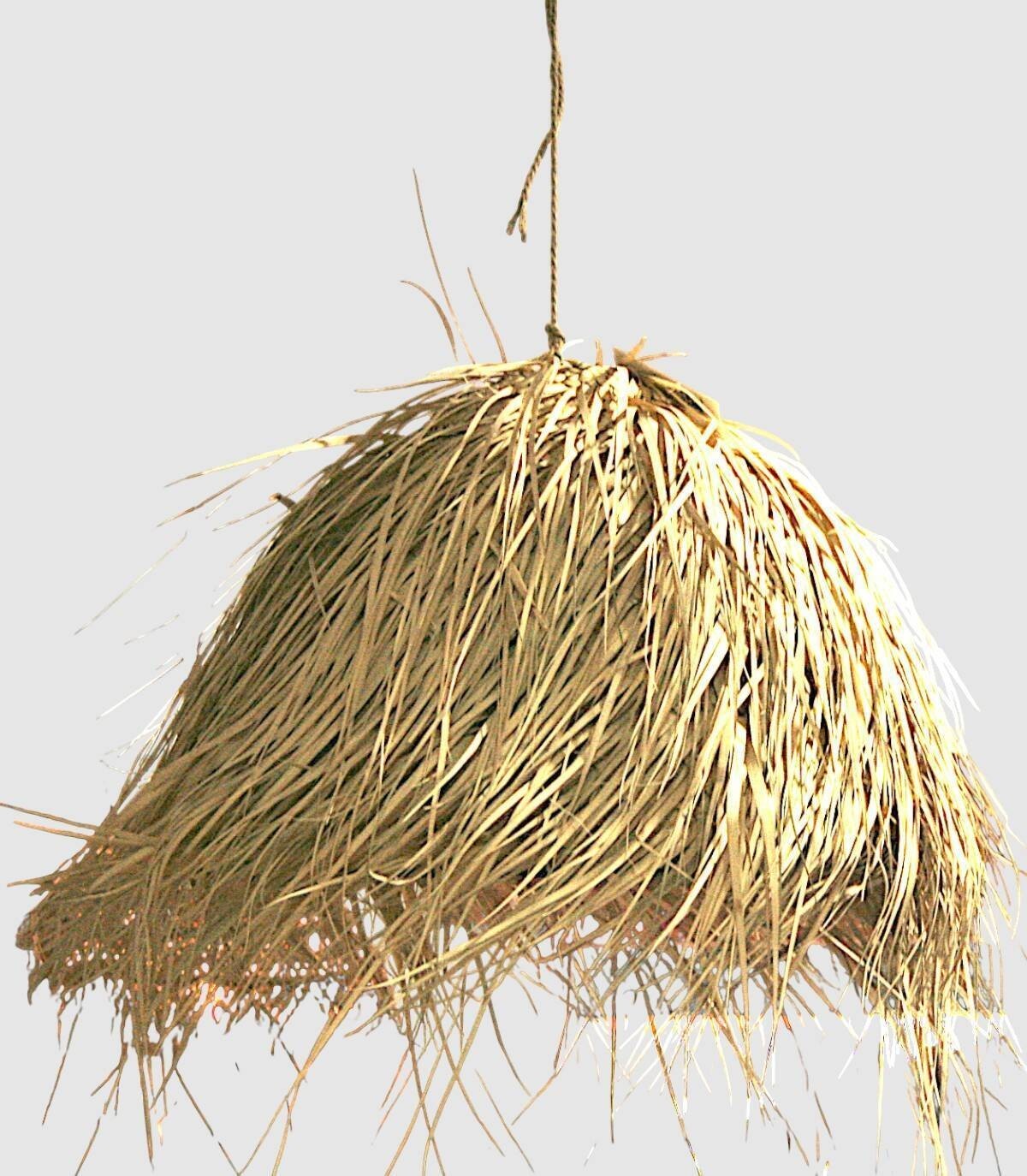 Esta lámpara para colgar redonda hecha artesanalmente de hojas de palma da un toque étnico en cualquier sitio donde se instale, cambia de color según el uso si se usa en el exterior cambiando a un color mas amarillo.