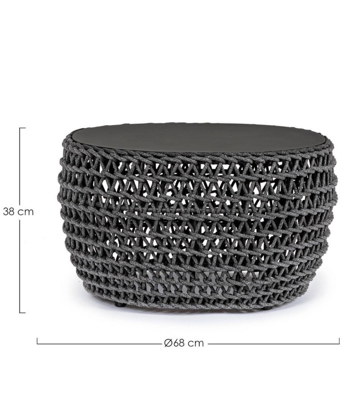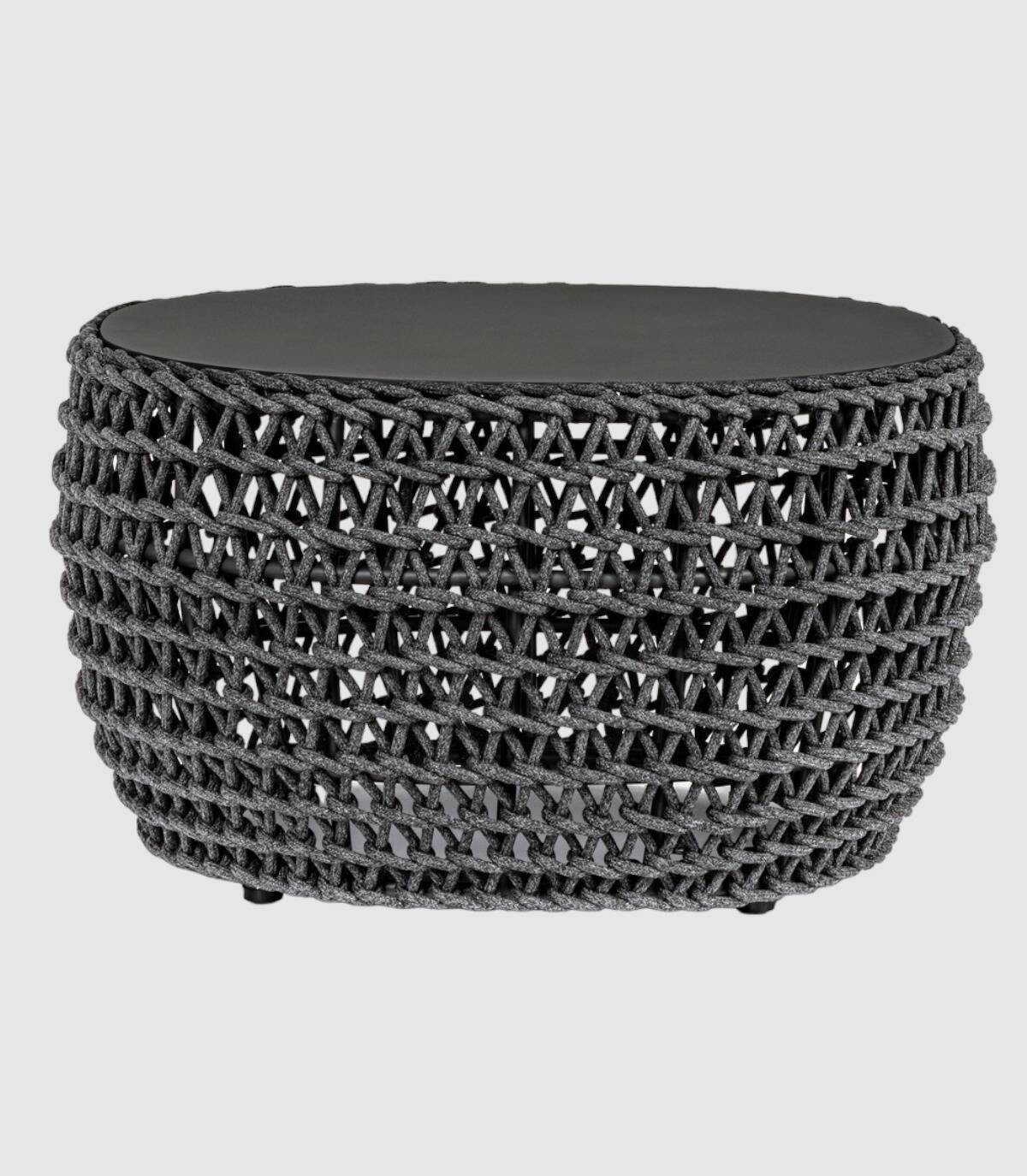 The Cuyen charcoal coffee table has an aluminum structure and top. powder coated (polyester), braided with olefin rope (100% Polypropylene).