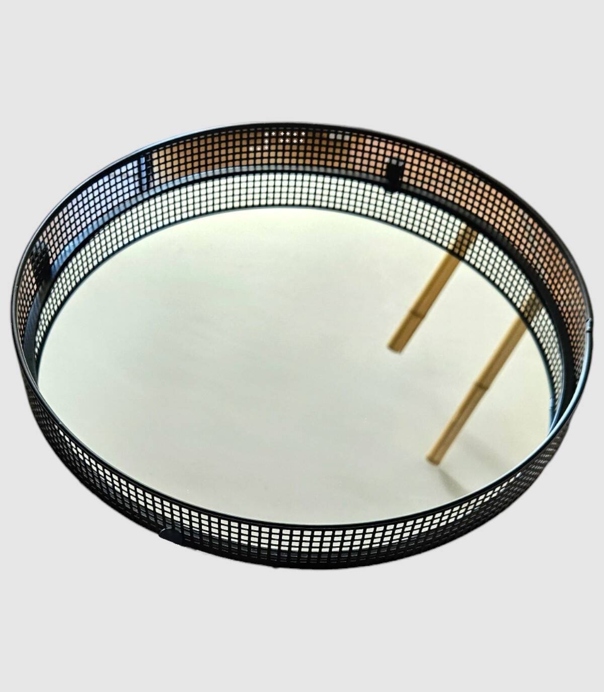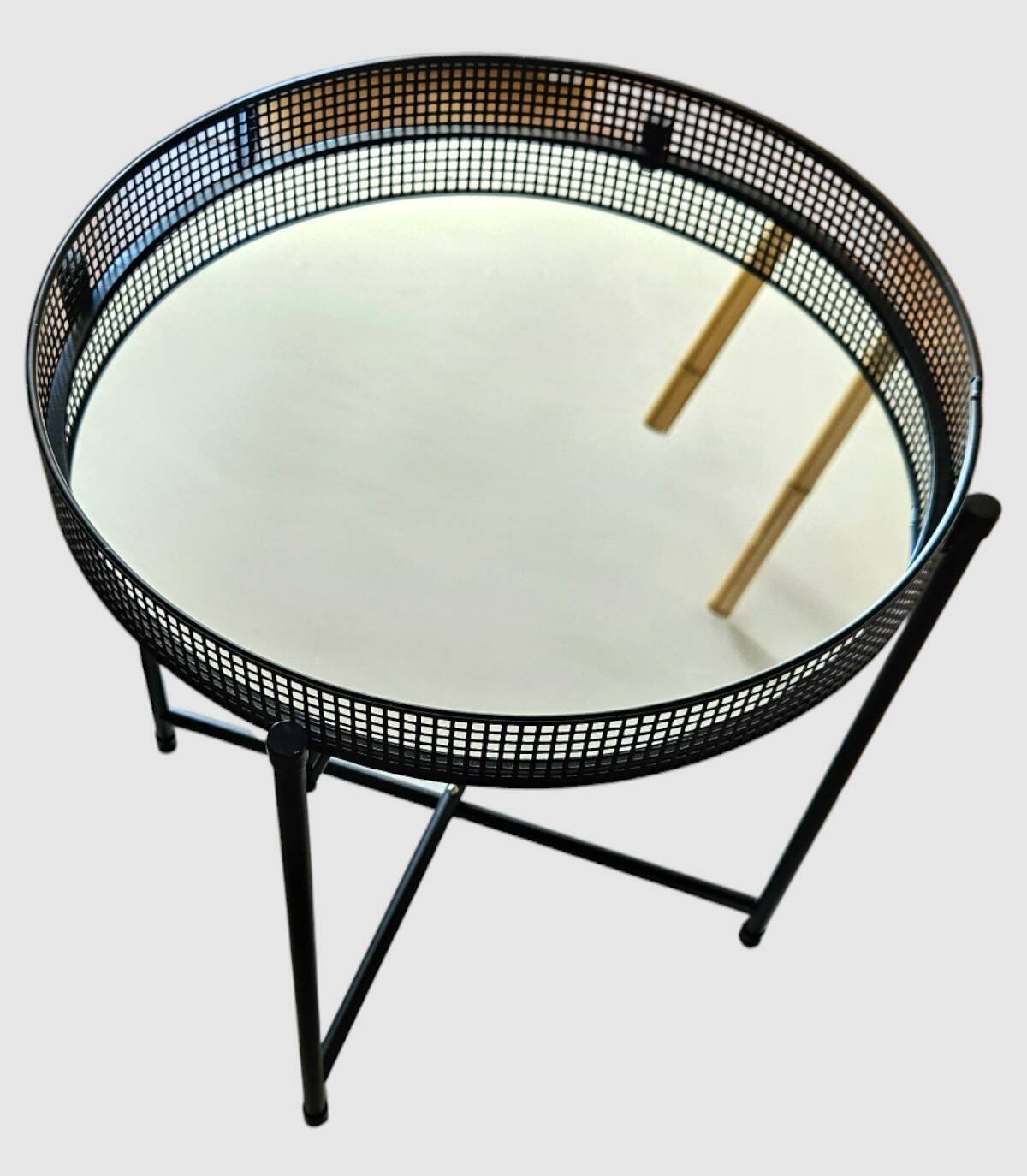 cI enter black with a mirror, This elegant mirrored coffee table is a unique piece that combines modern style and functionality. Its black metal base gives it a sophisticated and timeless touch. The 44 cm diameter (approximately 17 inches) round mirror is perfect for reflecting light and creating a feeling of spaciousness in any space. With a height of 49 cm (approximately 19 inches), this table is ideal for placing magazines, books or a decorative lamp. Its compact design makes it a great option for small living rooms or for use as a side table. Add a touch of elegance to your home with this black metal base mirrored coffee table.